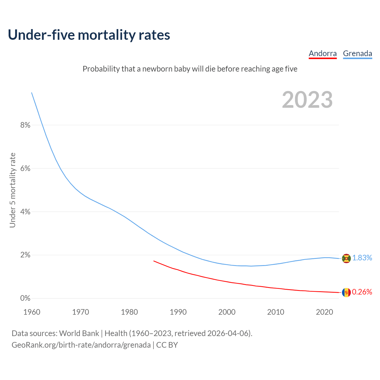 The chance that a newborn baby will die before reaching age five is 0.26% in Andorra and 1.83% in Grenada. Above is a chart with historical data on under-five mortality rates.