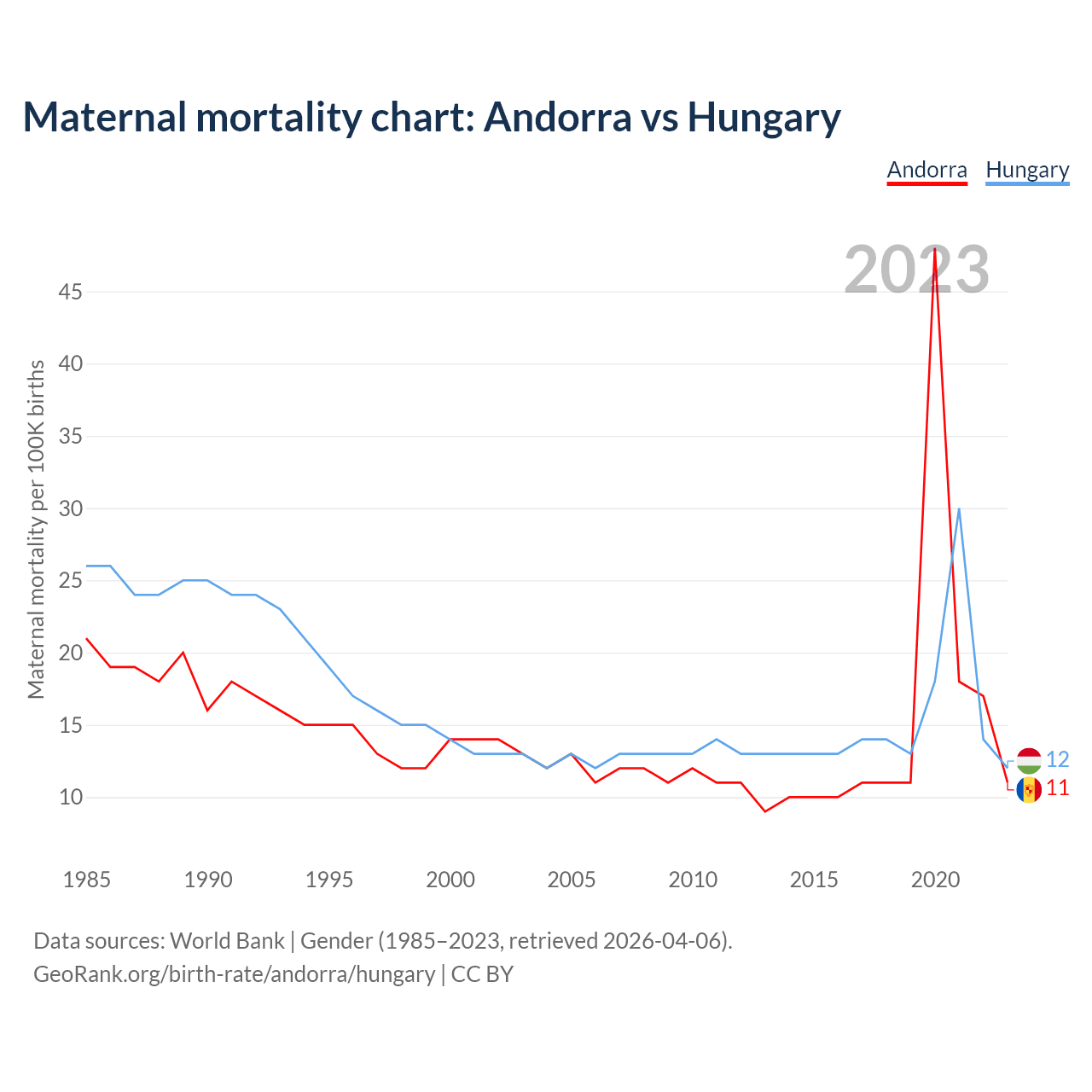 The maternal mortality rate, which is the probability of dying during childbirth or within 42 days of pregnancy termination, is 11 deaths per 100,000 live births in Andorra, compared to 12 deaths in Hungary.