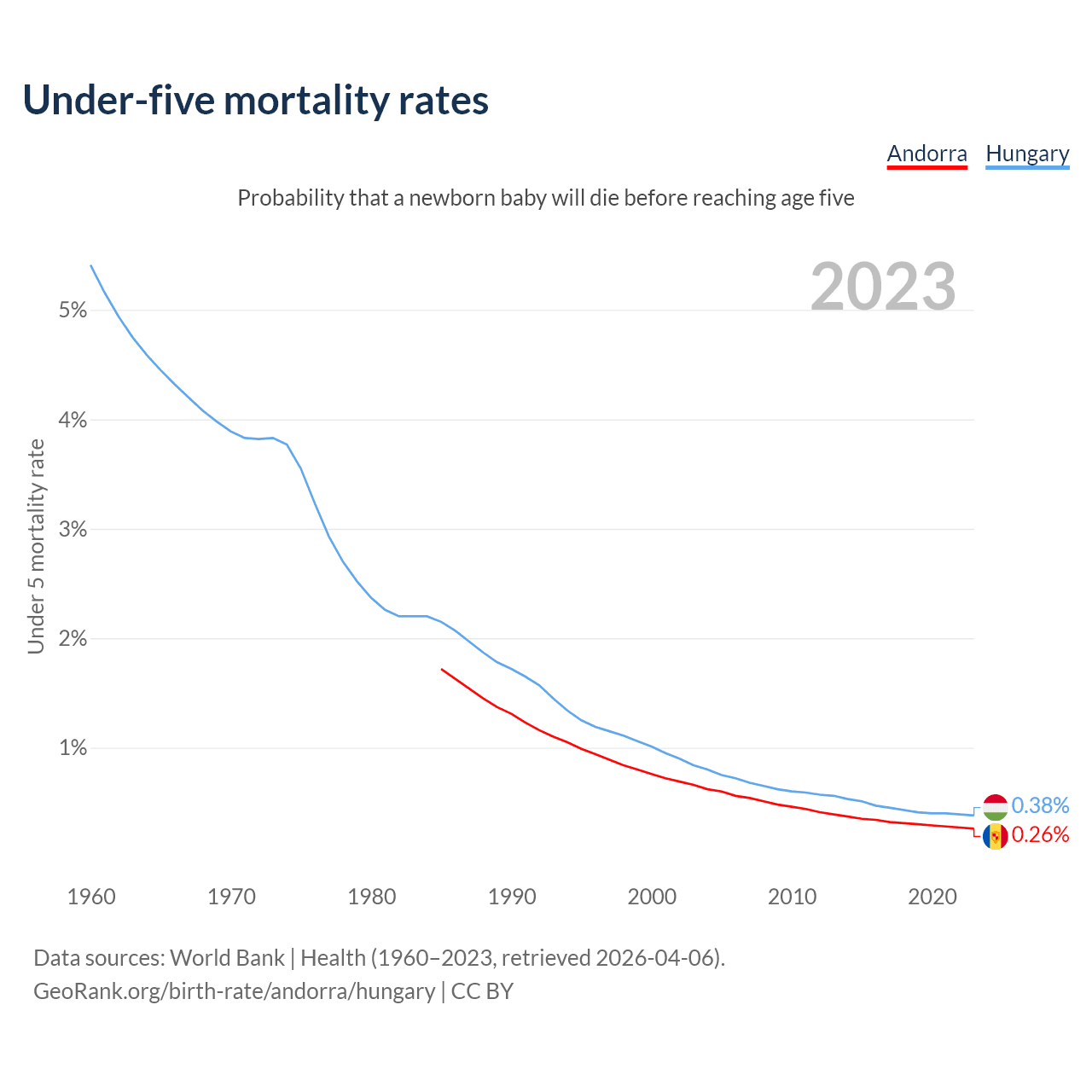 The chance that a newborn baby will die before reaching age five is 0.26% in Andorra and 0.38% in Hungary. Above is a chart with historical data on under-five mortality rates.