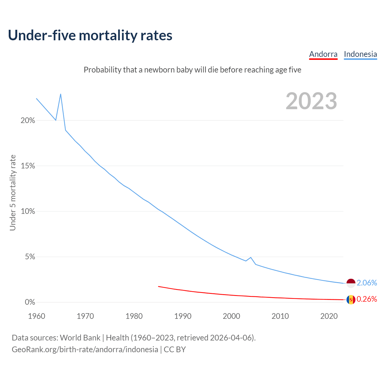 The chance that a newborn baby will die before reaching age five is 0.26% in Andorra and 2.06% in Indonesia. Above is a chart with historical data on under-five mortality rates.