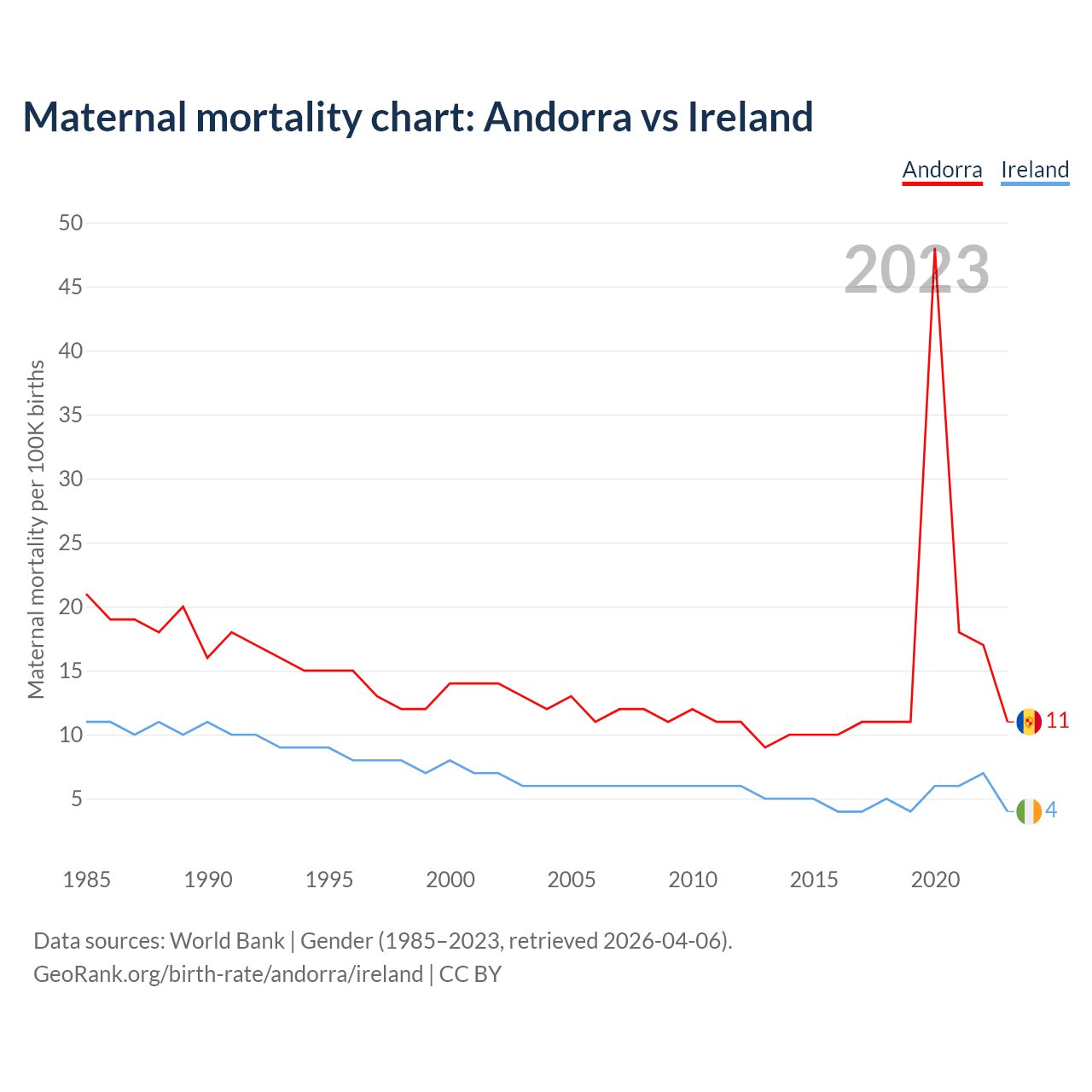 The maternal mortality rate, which is the probability of dying during childbirth or within 42 days of pregnancy termination, is 11 deaths per 100,000 live births in Andorra, compared to 4 deaths in Ireland.