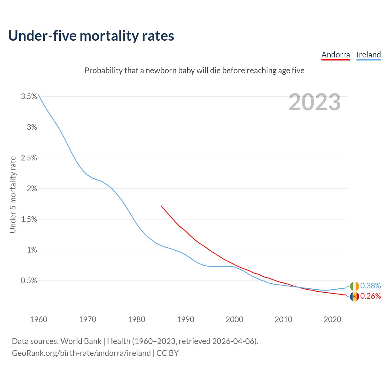 The chance that a newborn baby will die before reaching age five is 0.26% in Andorra and 0.38% in Ireland. Above is a chart with historical data on under-five mortality rates.