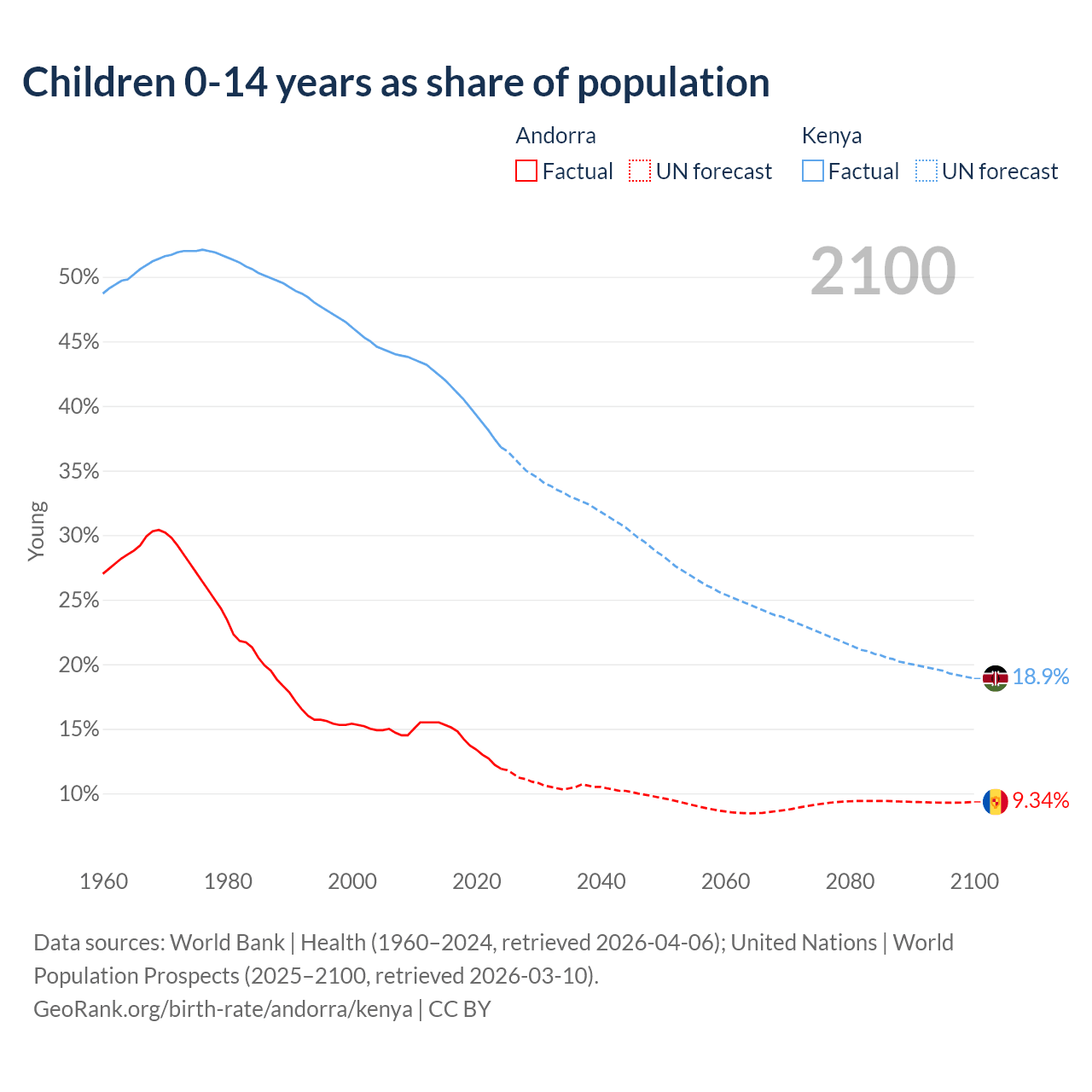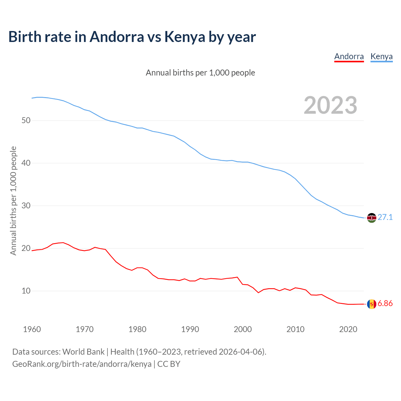 Andorra has an annual birth rate of 6.86 births per 1,000 people, compared to 27.1 for Kenya. The average number of children a woman is expected to have during her lifetime — the fertility rate, is 1.08 in Andorra and 3.21 in Kenya — 196.5% difference.