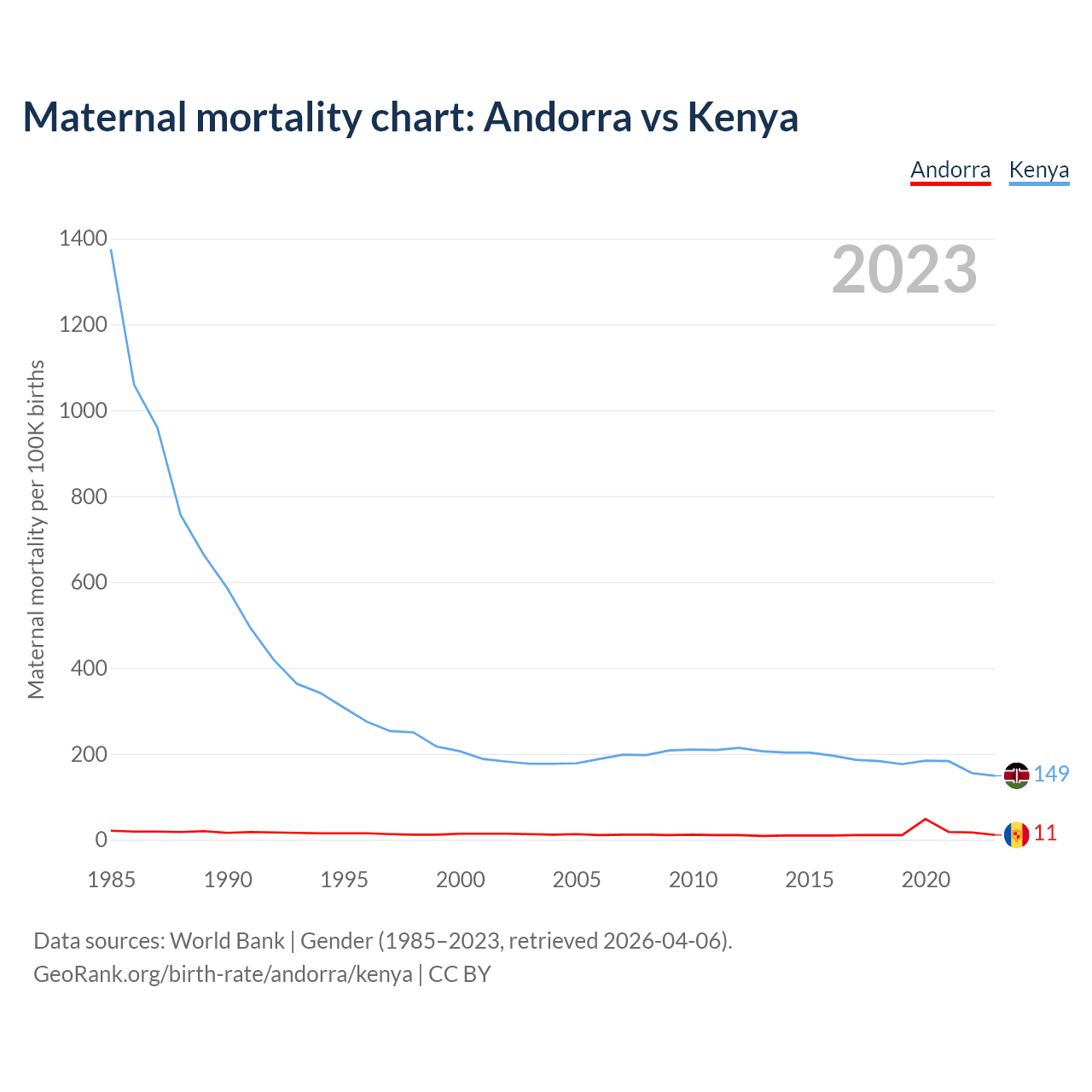 The maternal mortality rate, which is the probability of dying during childbirth or within 42 days of pregnancy termination, is 11 deaths per 100,000 live births in Andorra, compared to 149 deaths in Kenya.