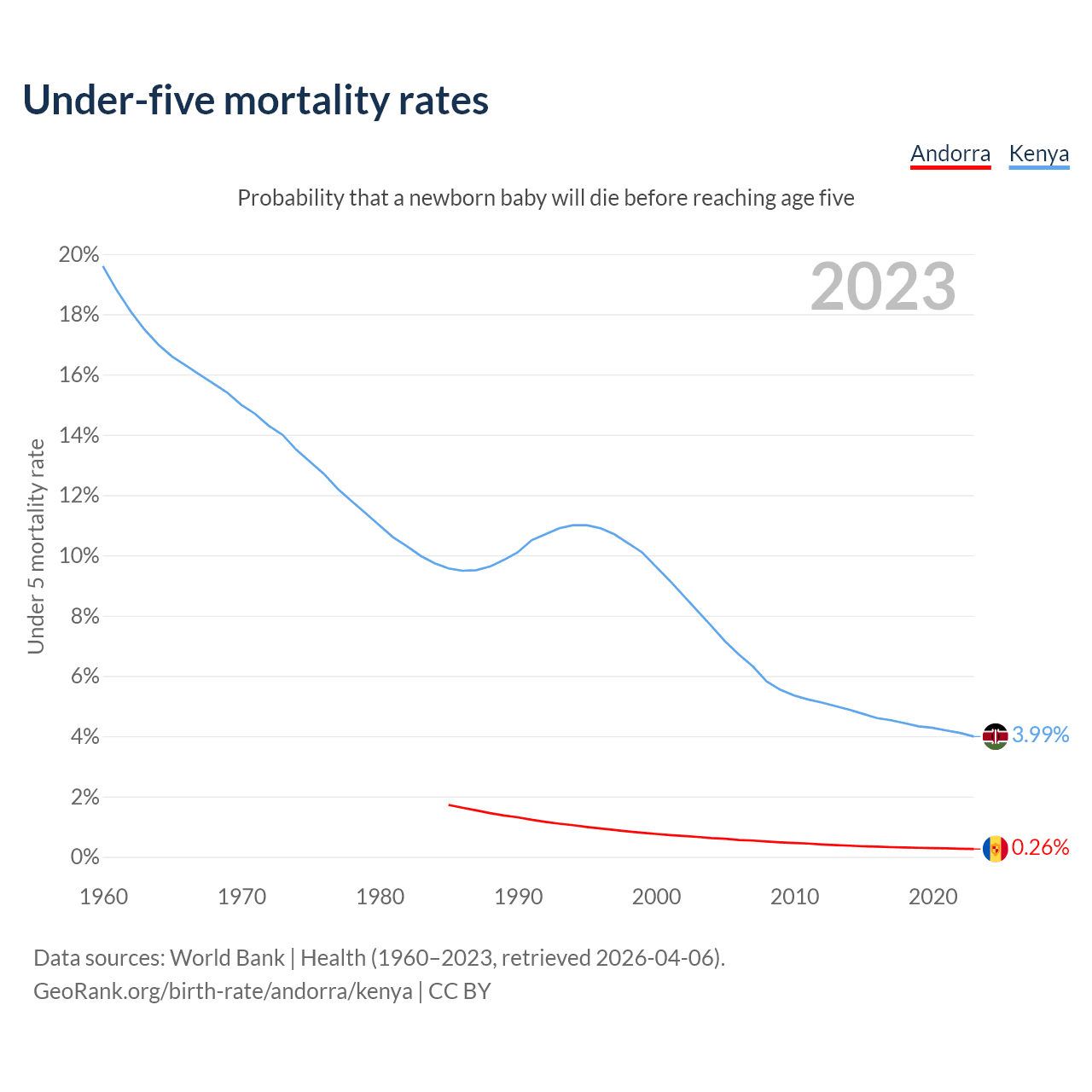 The chance that a newborn baby will die before reaching age five is 0.26% in Andorra and 3.99% in Kenya. Above is a chart with historical data on under-five mortality rates.