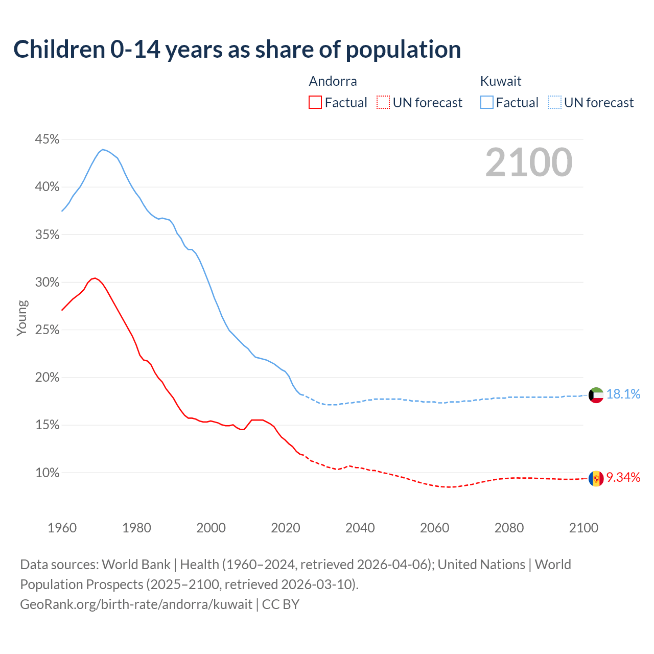 Andorra has an annual birth rate of 6.86 births per 1,000 people, compared to 10.3 for Kuwait. The average number of children a woman is expected to have during her lifetime — the fertility rate, is 1.08 in Andorra and 1.52 in Kuwait — 40.9% difference.