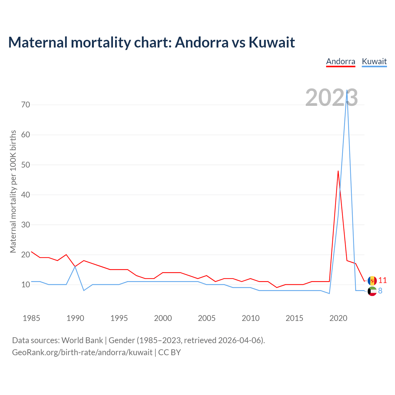 The maternal mortality rate, which is the probability of dying during childbirth or within 42 days of pregnancy termination, is 11 deaths per 100,000 live births in Andorra, compared to 8 deaths in Kuwait.