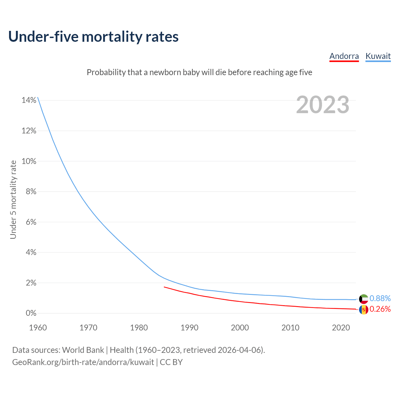 The chance that a newborn baby will die before reaching age five is 0.26% in Andorra and 0.88% in Kuwait. Above is a chart with historical data on under-five mortality rates.