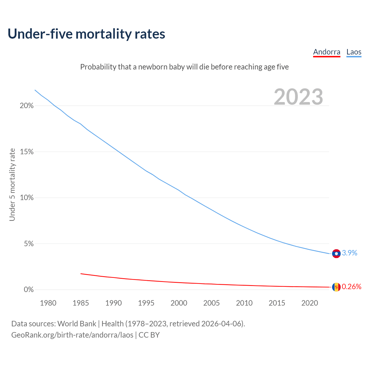 The chance that a newborn baby will die before reaching age five is 0.26% in Andorra and 3.9% in Laos. Above is a chart with historical data on under-five mortality rates.