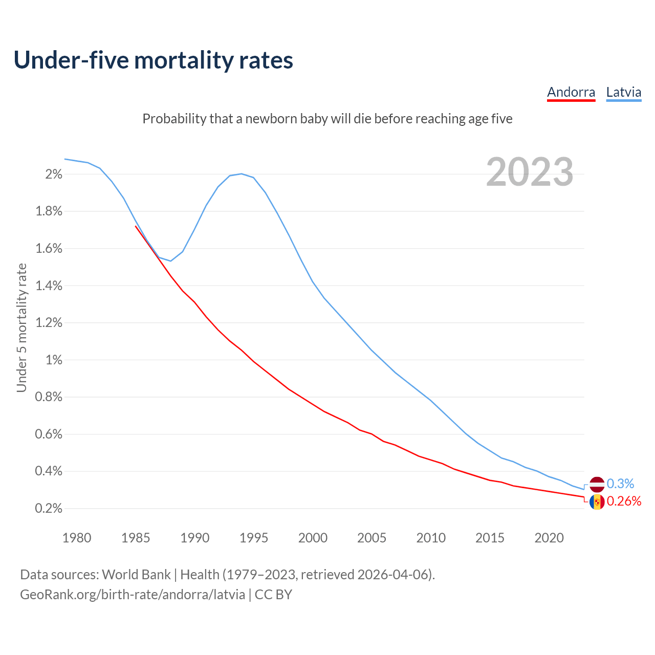 The chance that a newborn baby will die before reaching age five is 0.26% in Andorra and 0.3% in Latvia. Above is a chart with historical data on under-five mortality rates.