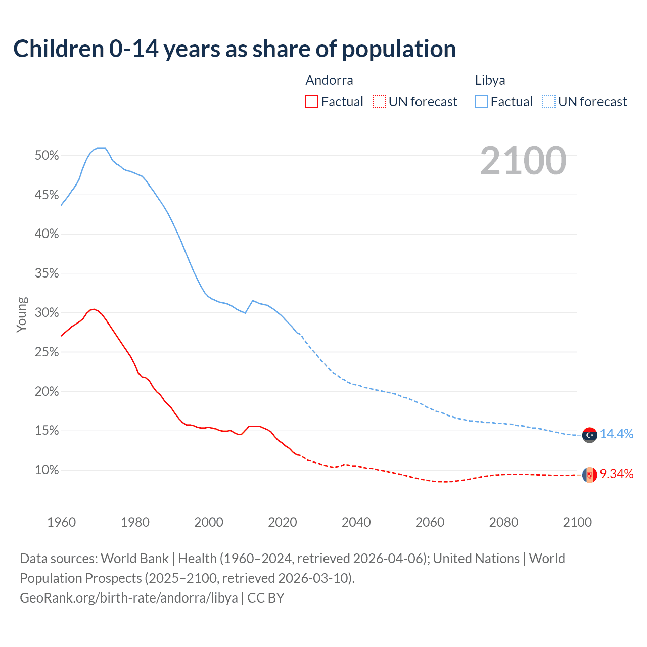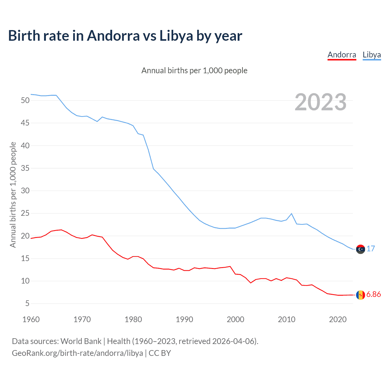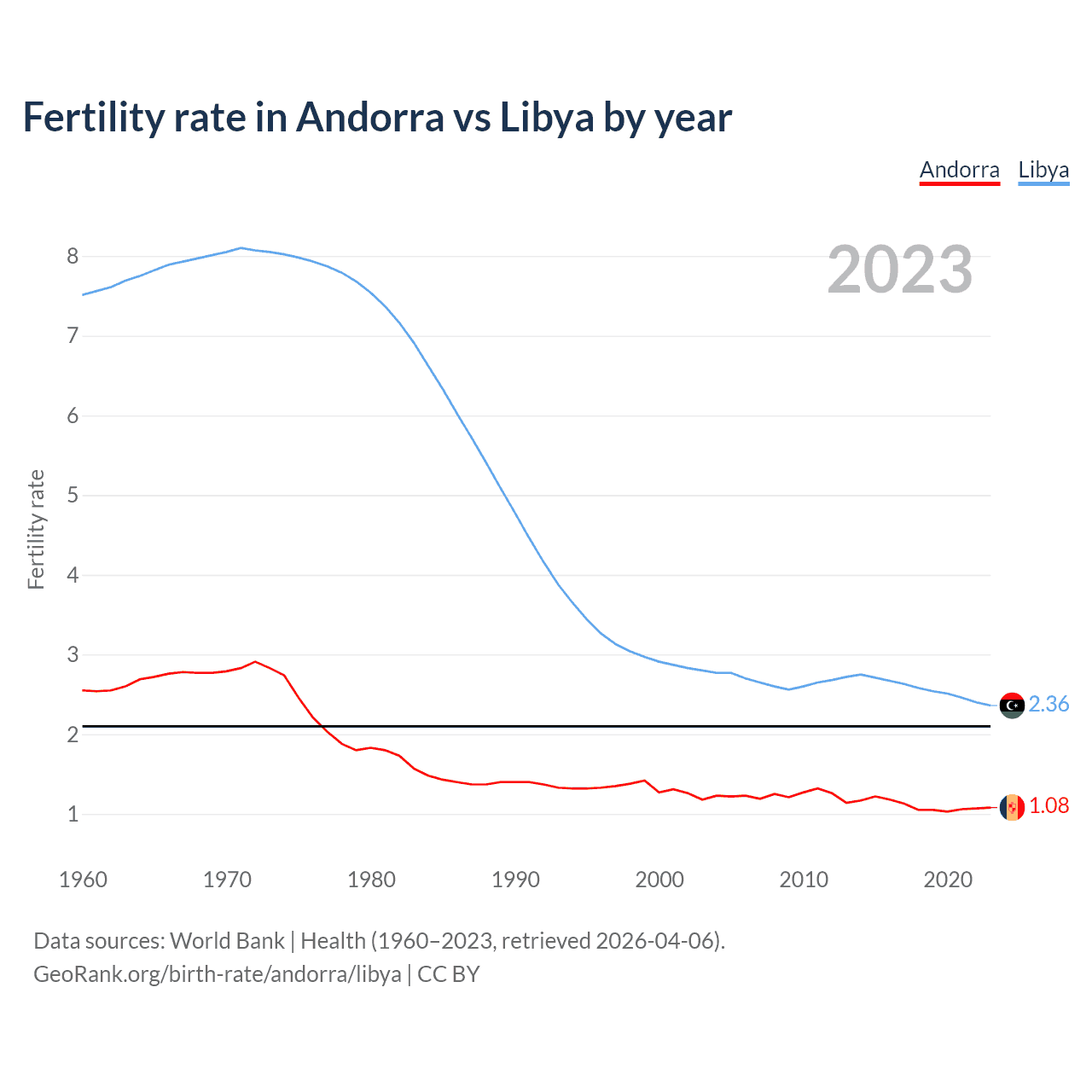 Andorra has an annual birth rate of 6.86 births per 1,000 people, compared to 17 for Libya. The average number of children a woman is expected to have during her lifetime — the fertility rate, is 1.08 in Andorra and 2.36 in Libya — 117.7% difference.