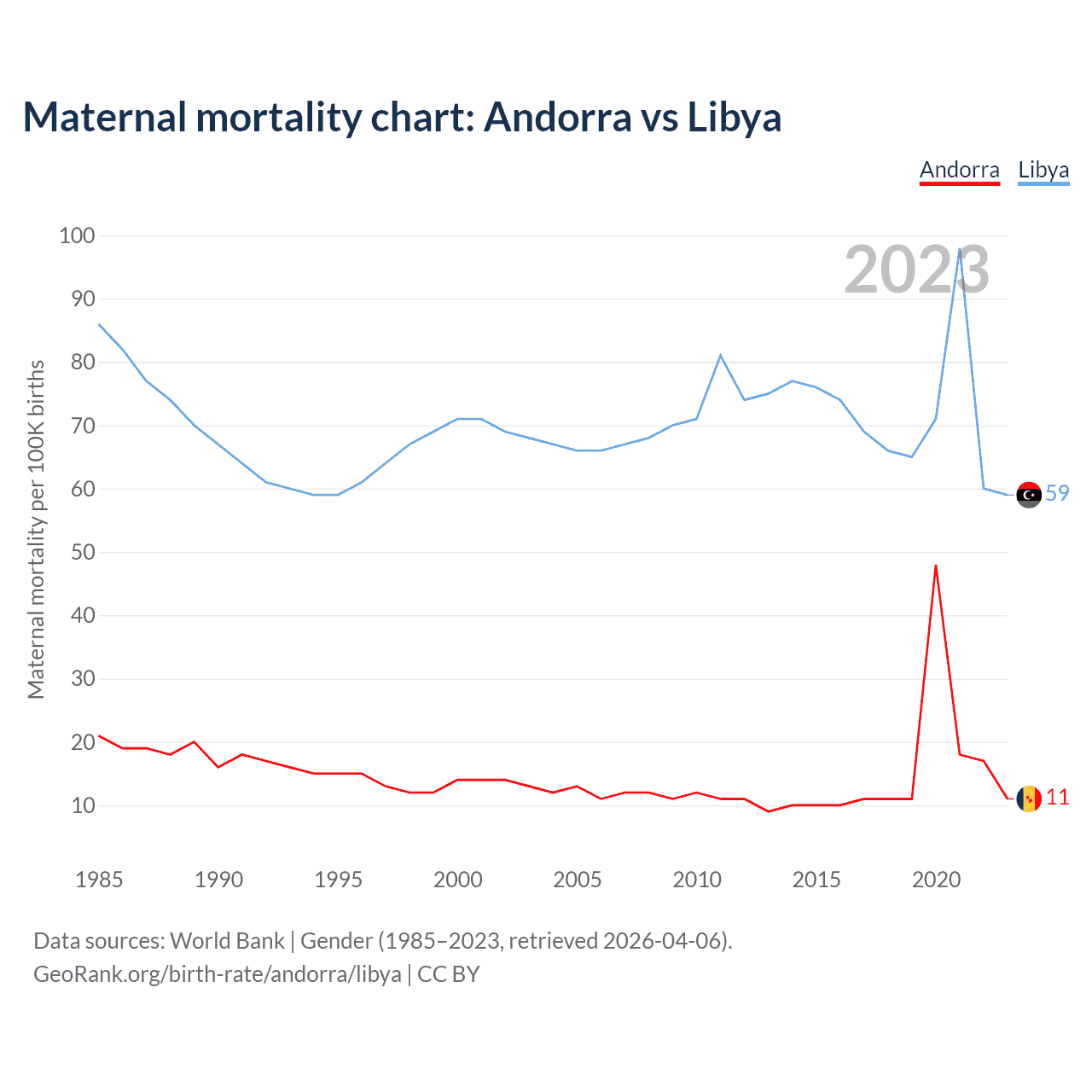 The maternal mortality rate, which is the probability of dying during childbirth or within 42 days of pregnancy termination, is 11 deaths per 100,000 live births in Andorra, compared to 59 deaths in Libya.