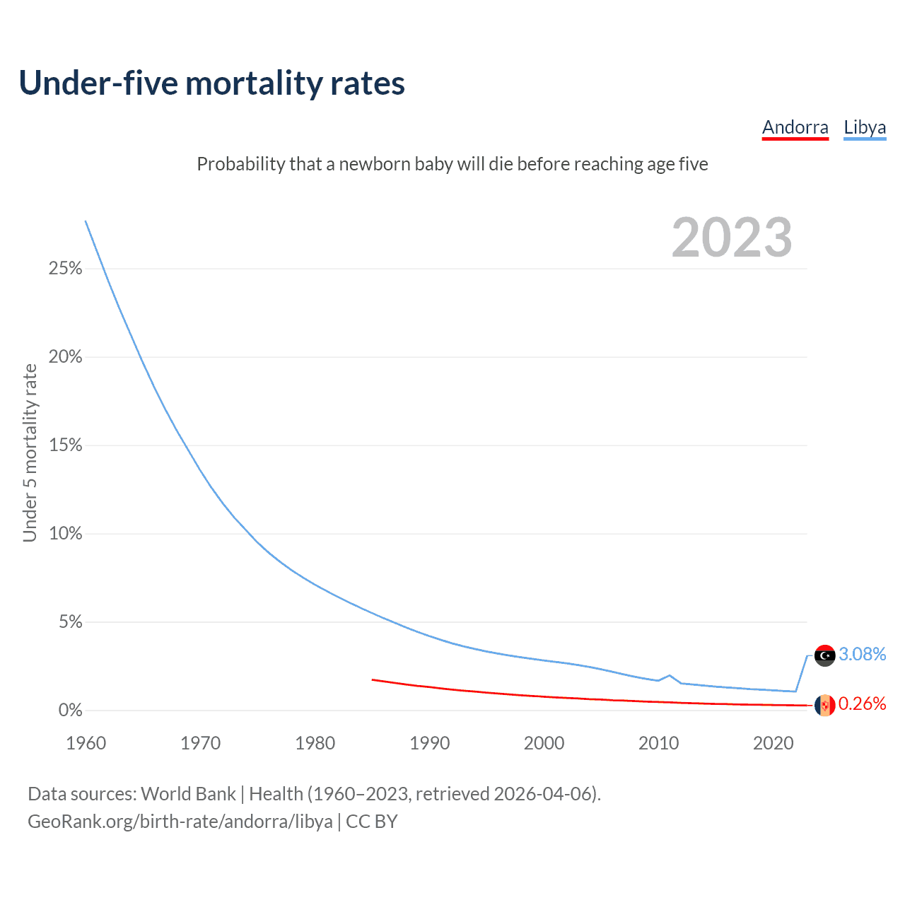 The chance that a newborn baby will die before reaching age five is 0.26% in Andorra and 3.08% in Libya. Above is a chart with historical data on under-five mortality rates.