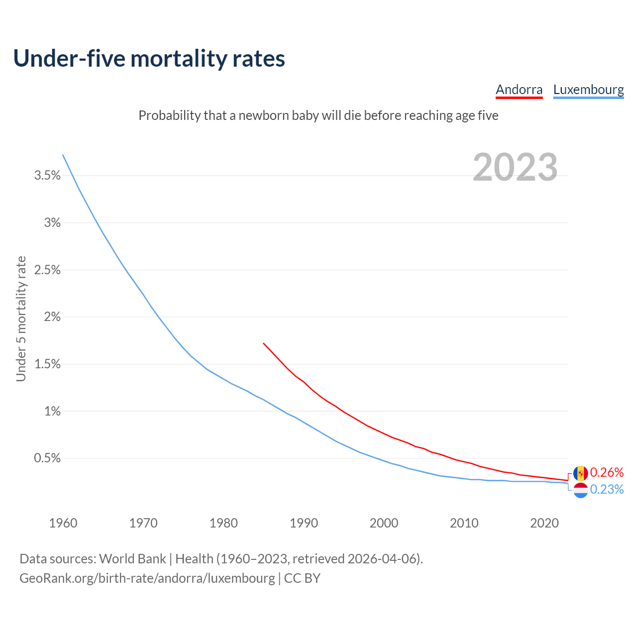The chance that a newborn baby will die before reaching age five is 0.26% in Andorra and 0.23% in Luxembourg. Above is a chart with historical data on under-five mortality rates.