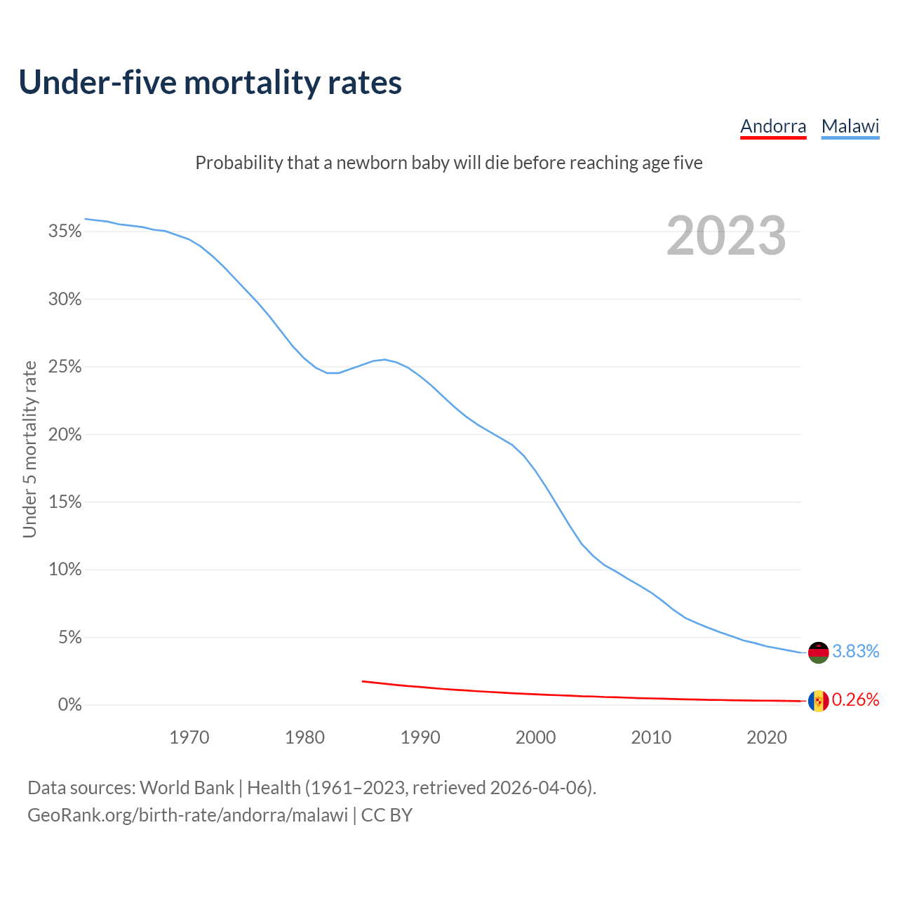 The chance that a newborn baby will die before reaching age five is 0.26% in Andorra and 3.83% in Malawi. Above is a chart with historical data on under-five mortality rates.