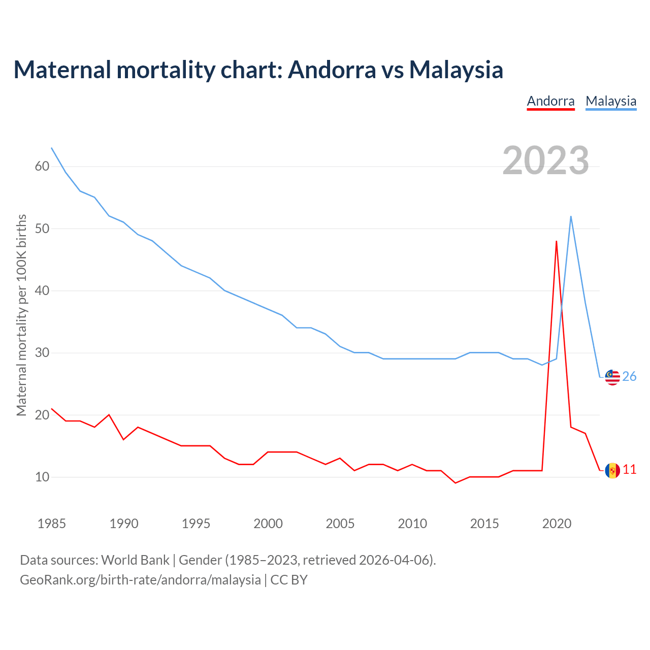 The maternal mortality rate, which is the probability of dying during childbirth or within 42 days of pregnancy termination, is 11 deaths per 100,000 live births in Andorra, compared to 26 deaths in Malaysia.