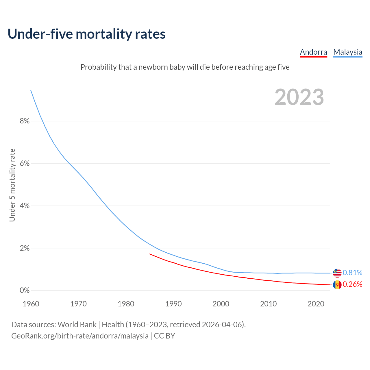 The chance that a newborn baby will die before reaching age five is 0.26% in Andorra and 0.81% in Malaysia. Above is a chart with historical data on under-five mortality rates.