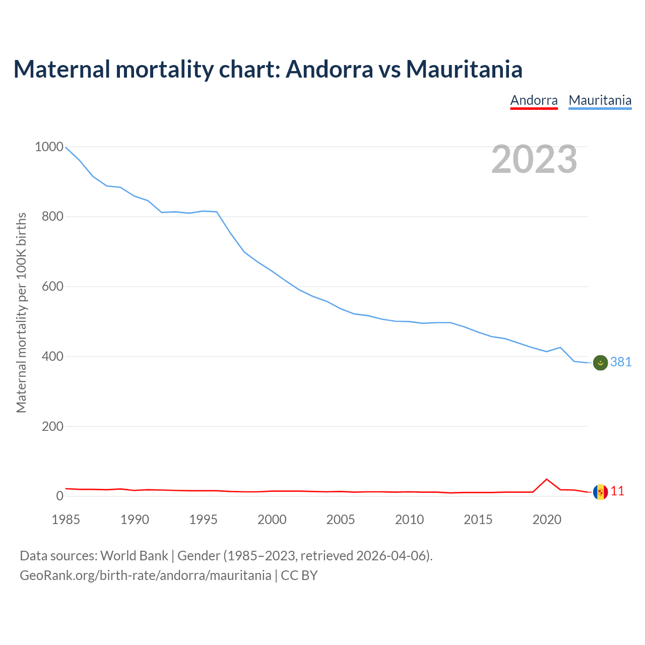 The maternal mortality rate, which is the probability of dying during childbirth or within 42 days of pregnancy termination, is 11 deaths per 100,000 live births in Andorra, compared to 381 deaths in Mauritania.