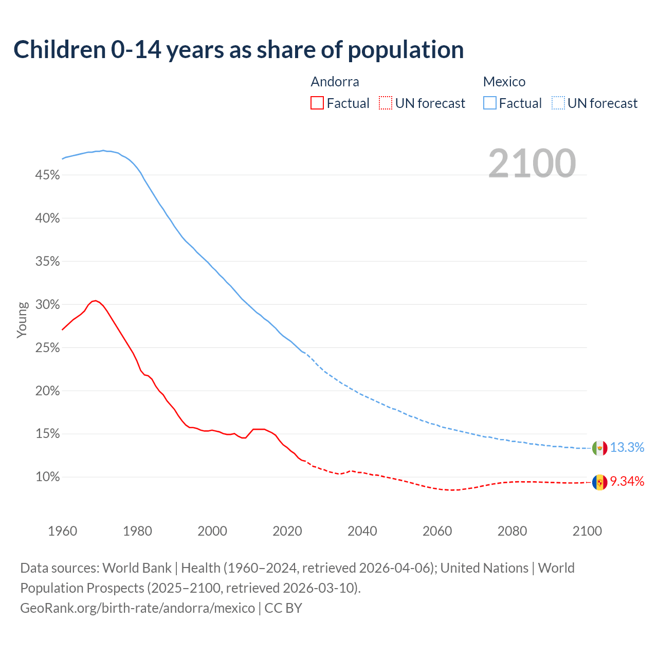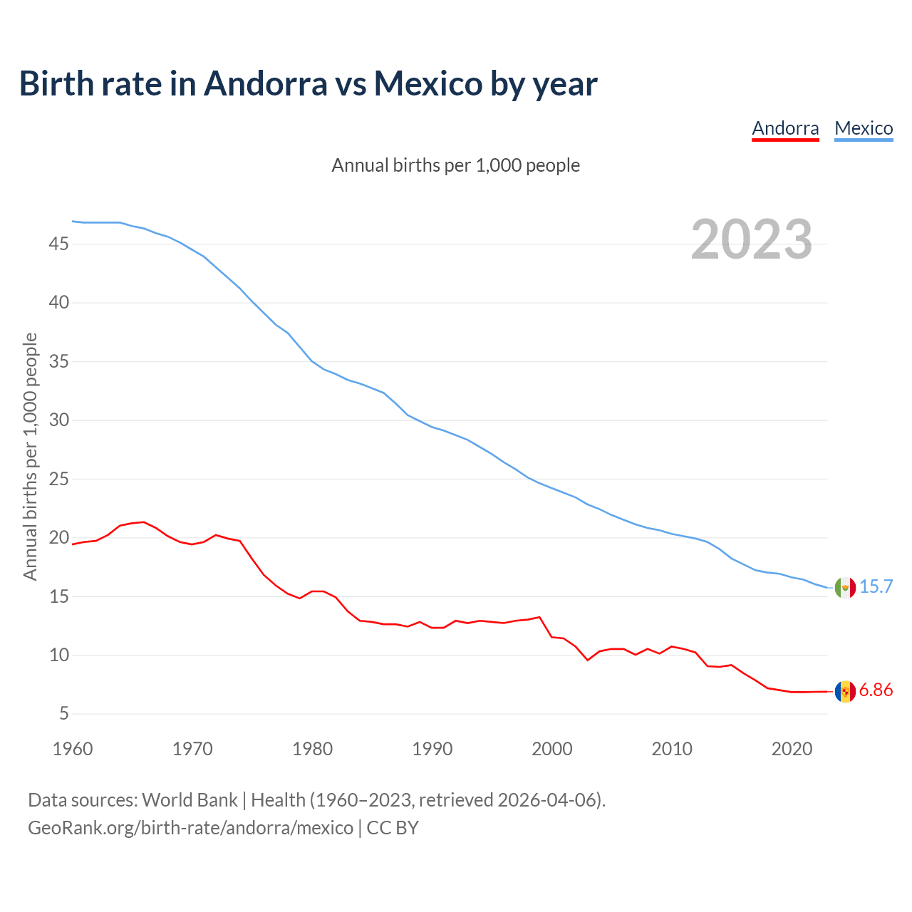 Andorra has an annual birth rate of 6.86 births per 1,000 people, compared to 15.7 for Mexico. The average number of children a woman is expected to have during her lifetime — the fertility rate, is 1.08 in Andorra and 1.91 in Mexico — 76.5% difference.
