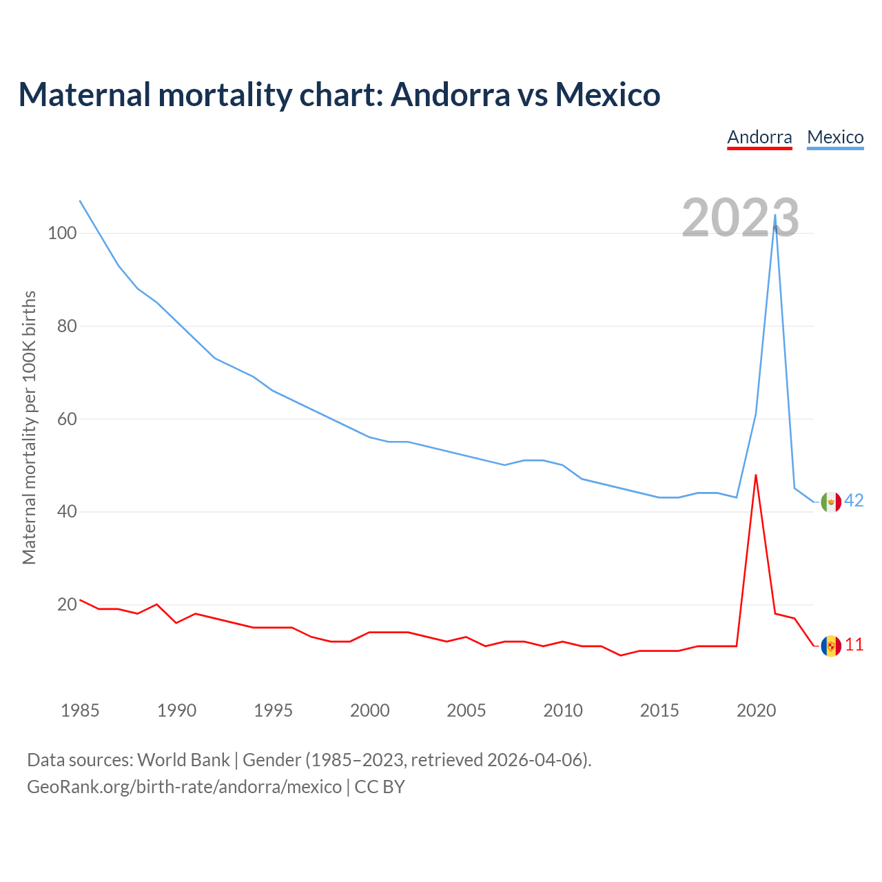 The maternal mortality rate, which is the probability of dying during childbirth or within 42 days of pregnancy termination, is 11 deaths per 100,000 live births in Andorra, compared to 42 deaths in Mexico.