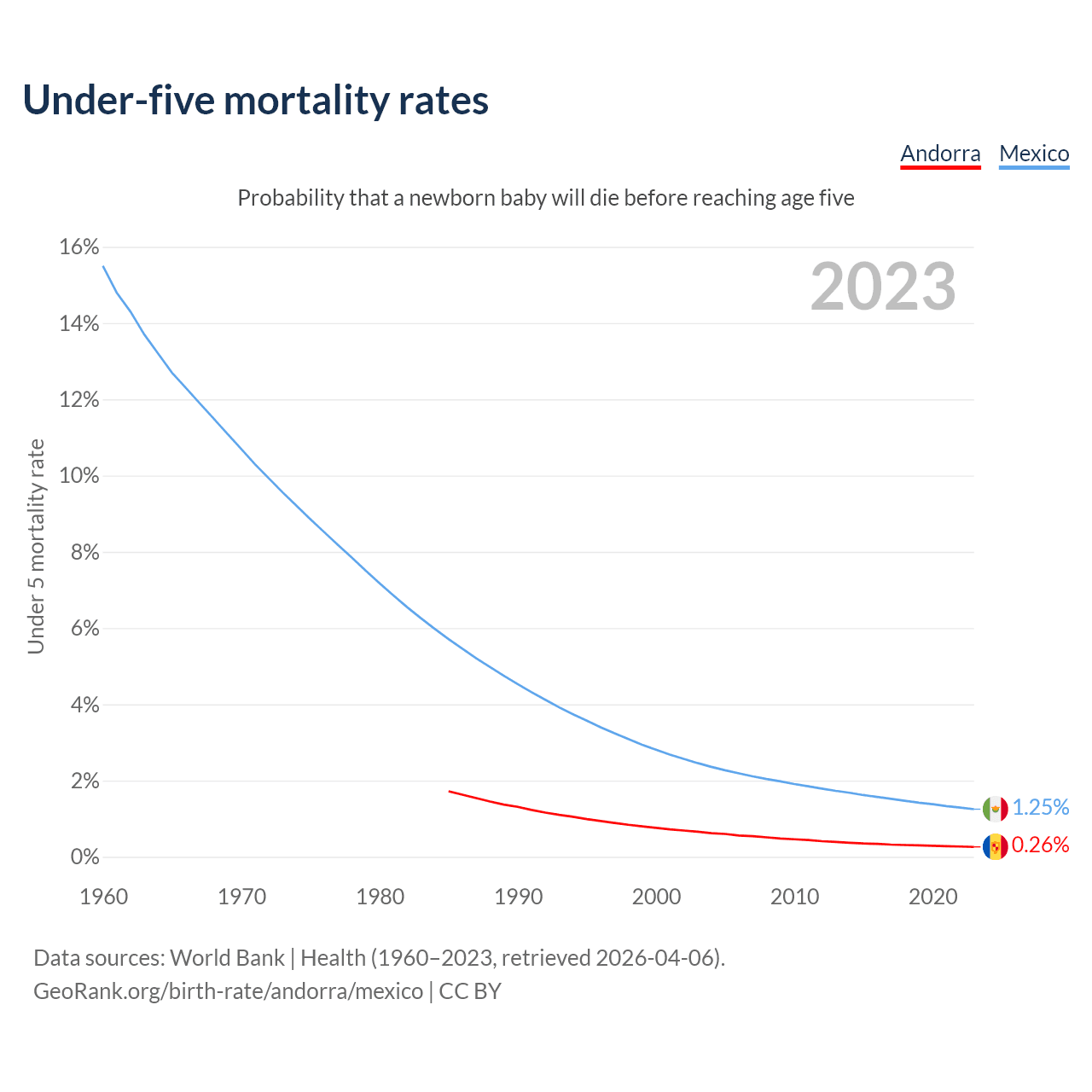 The chance that a newborn baby will die before reaching age five is 0.26% in Andorra and 1.25% in Mexico. Above is a chart with historical data on under-five mortality rates.
