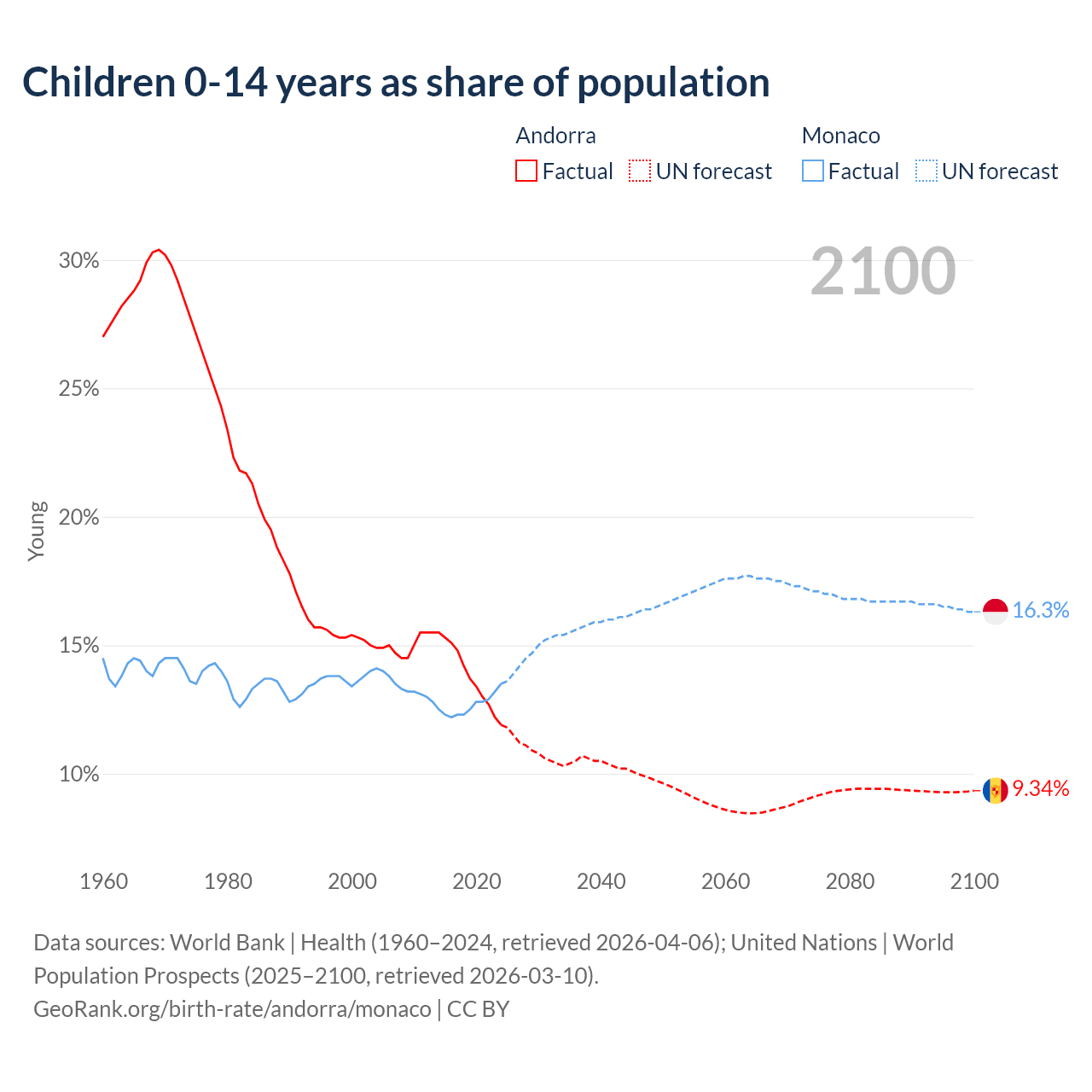 Children aged 0-14 make up 11.9% of the population in Andorra and 13.5% in Monaco in 2024, compared to 17.8% and 12.8% respectively in 1990.