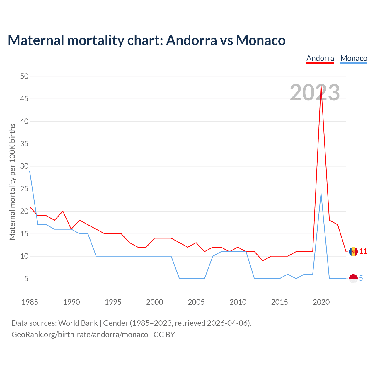 The maternal mortality rate, which is the probability of dying during childbirth or within 42 days of pregnancy termination, is 11 deaths per 100,000 live births in Andorra, compared to 5 deaths in Monaco.