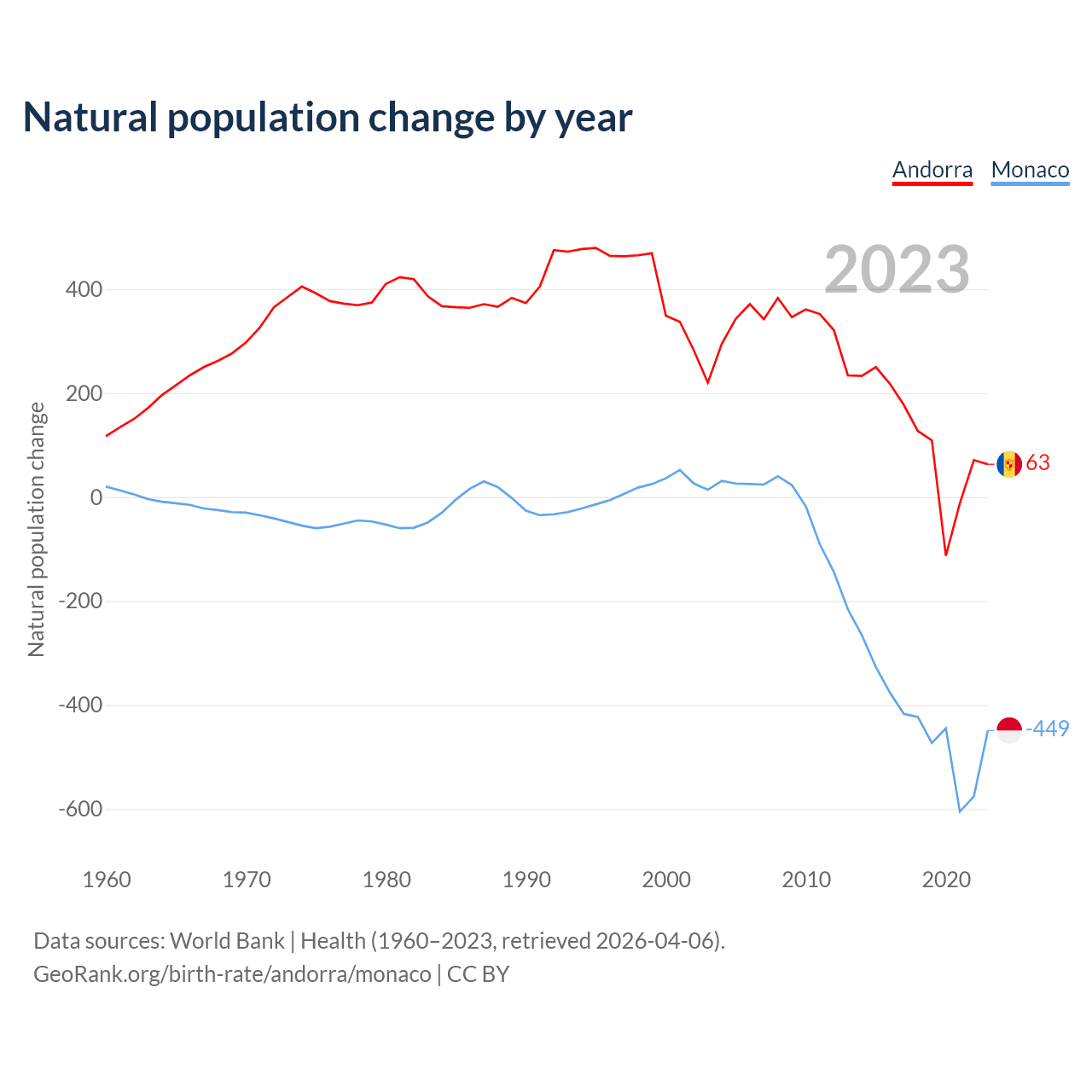 Andorra has an annual birth rate of 6.86 births per 1,000 people, compared to 9.44 for Monaco. The average number of children a woman is expected to have during her lifetime — the fertility rate, is 1.08 in Andorra and 2.11 in Monaco — 95% difference.