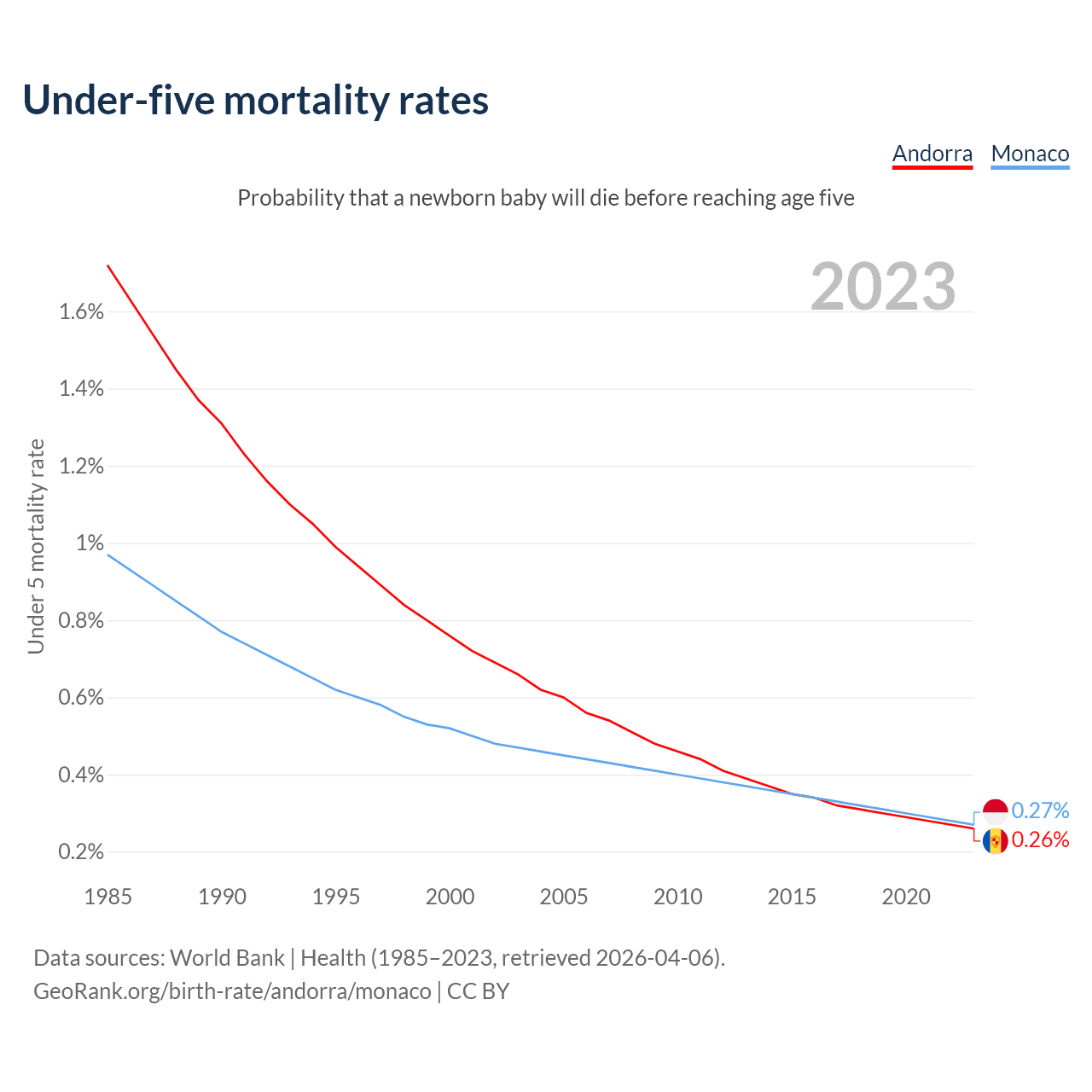 The chance that a newborn baby will die before reaching age five is 0.26% in Andorra and 0.27% in Monaco. Above is a chart with historical data on under-five mortality rates.
