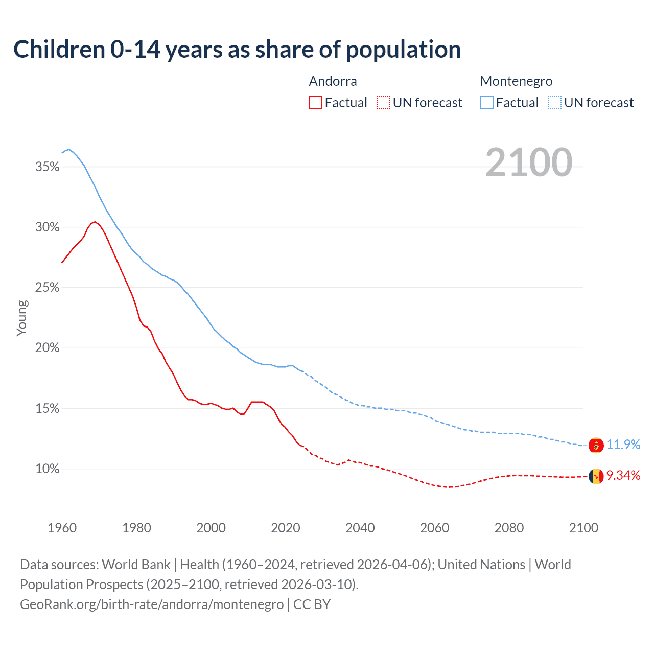 Children aged 0-14 make up 11.9% of the population in Andorra and 18.1% in Montenegro in 2024, compared to 17.8% and 25.6% respectively in 1990.