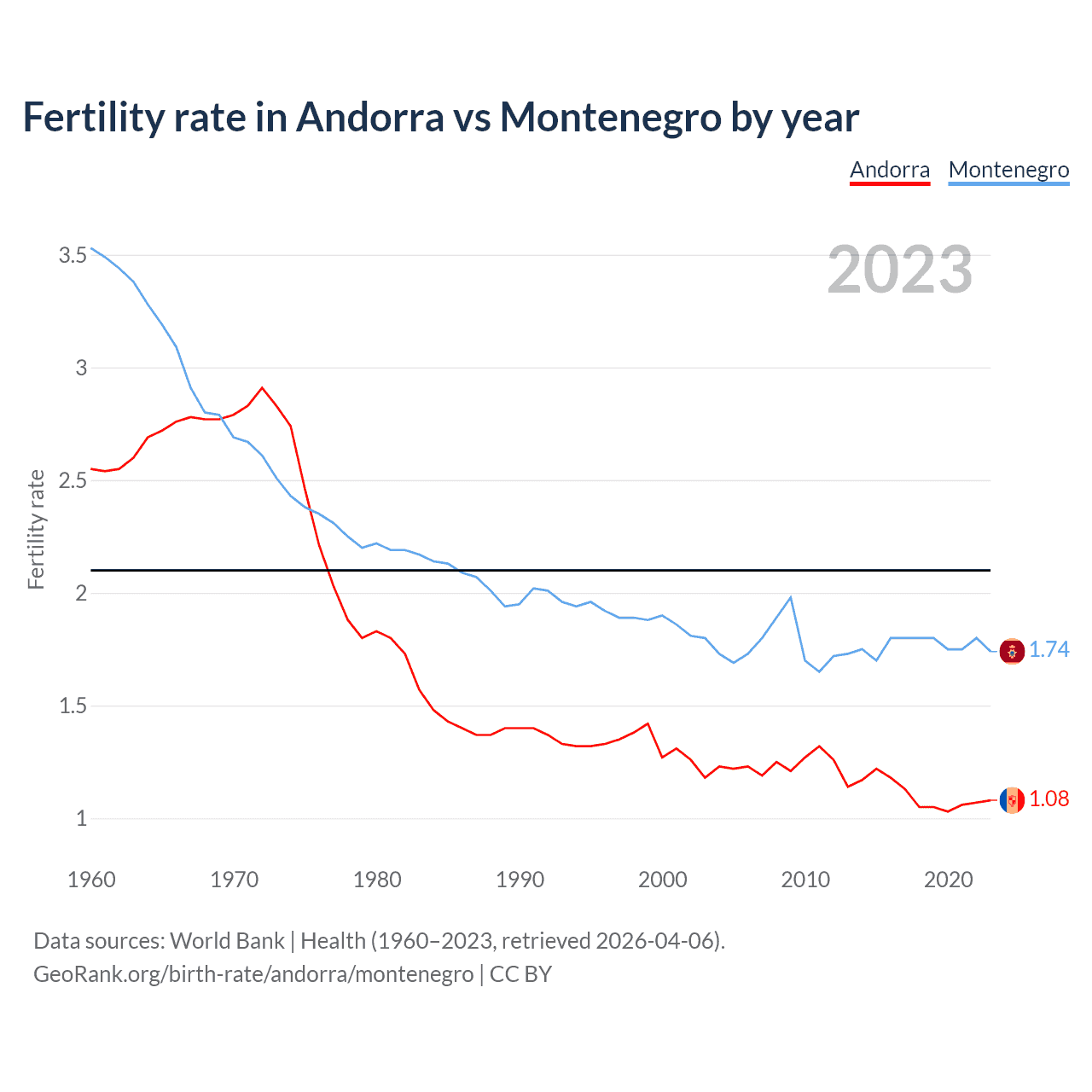 According to the latest available data on birth rates, the fertility rate in Andorra was 1.08 children per woman in 2023, compared to 1.74 in Montenegro in 2023. The replacement level is considered to be 2.1 children per woman.