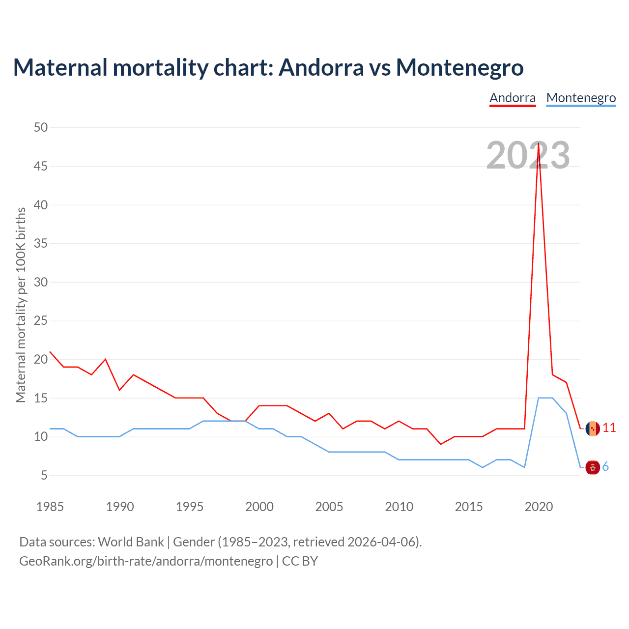The maternal mortality rate, which is the probability of dying during childbirth or within 42 days of pregnancy termination, is 11 deaths per 100,000 live births in Andorra, compared to 6 deaths in Montenegro.