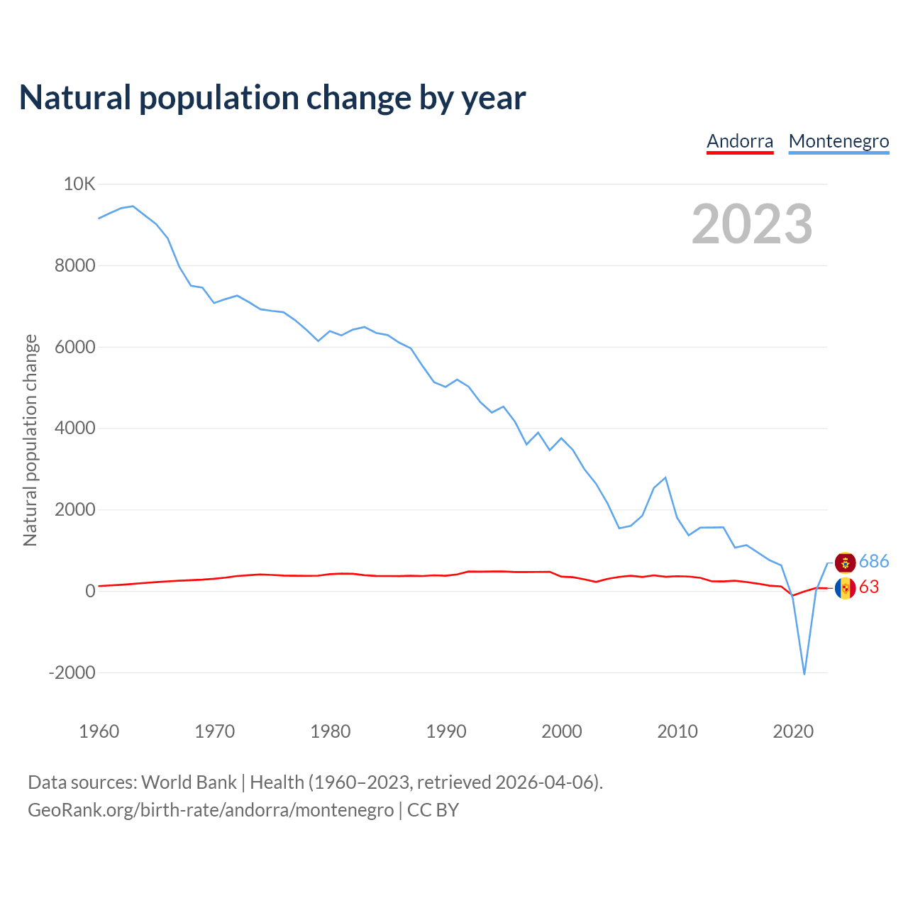 Andorra has an annual birth rate of 6.86 births per 1,000 people, compared to 11.2 for Montenegro. The average number of children a woman is expected to have during her lifetime — the fertility rate, is 1.08 in Andorra and 1.74 in Montenegro — 60.8% difference.