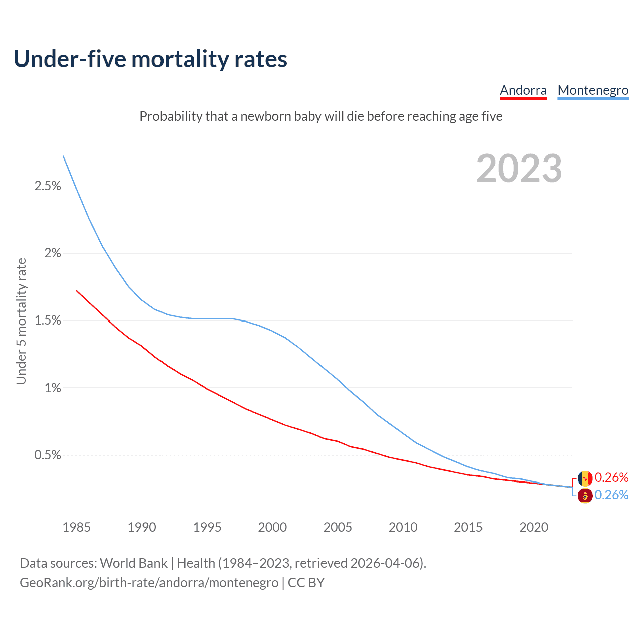 The chance that a newborn baby will die before reaching age five is 0.26% in Andorra and 0.26% in Montenegro. Above is a chart with historical data on under-five mortality rates.