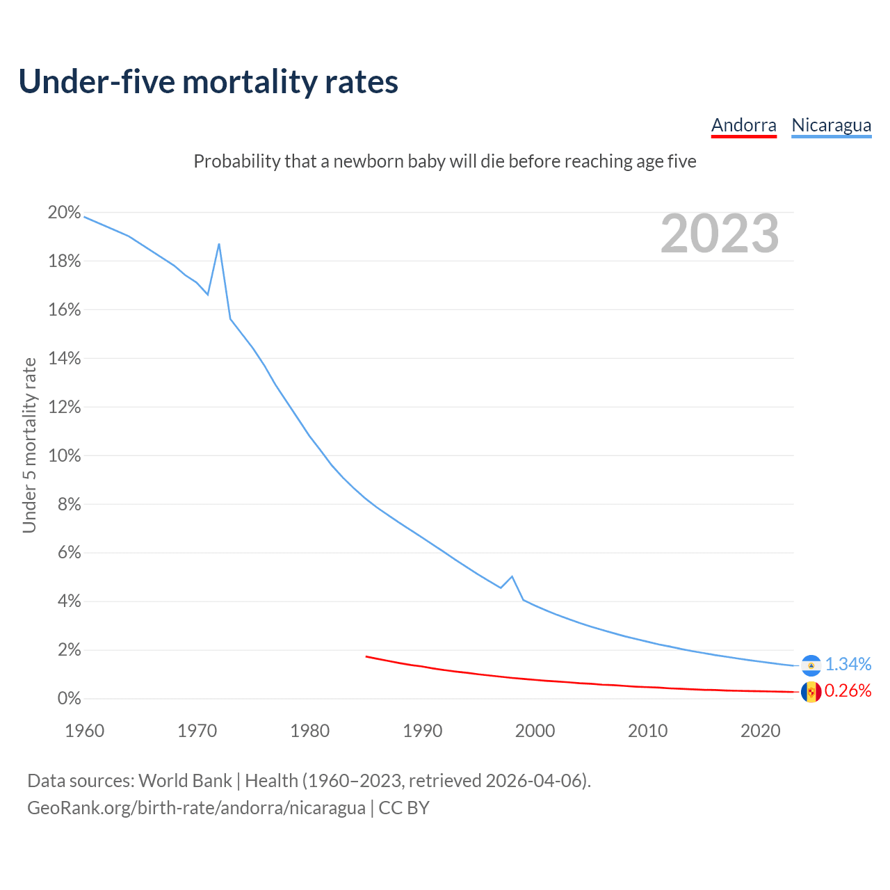 The chance that a newborn baby will die before reaching age five is 0.26% in Andorra and 1.34% in Nicaragua. Above is a chart with historical data on under-five mortality rates.