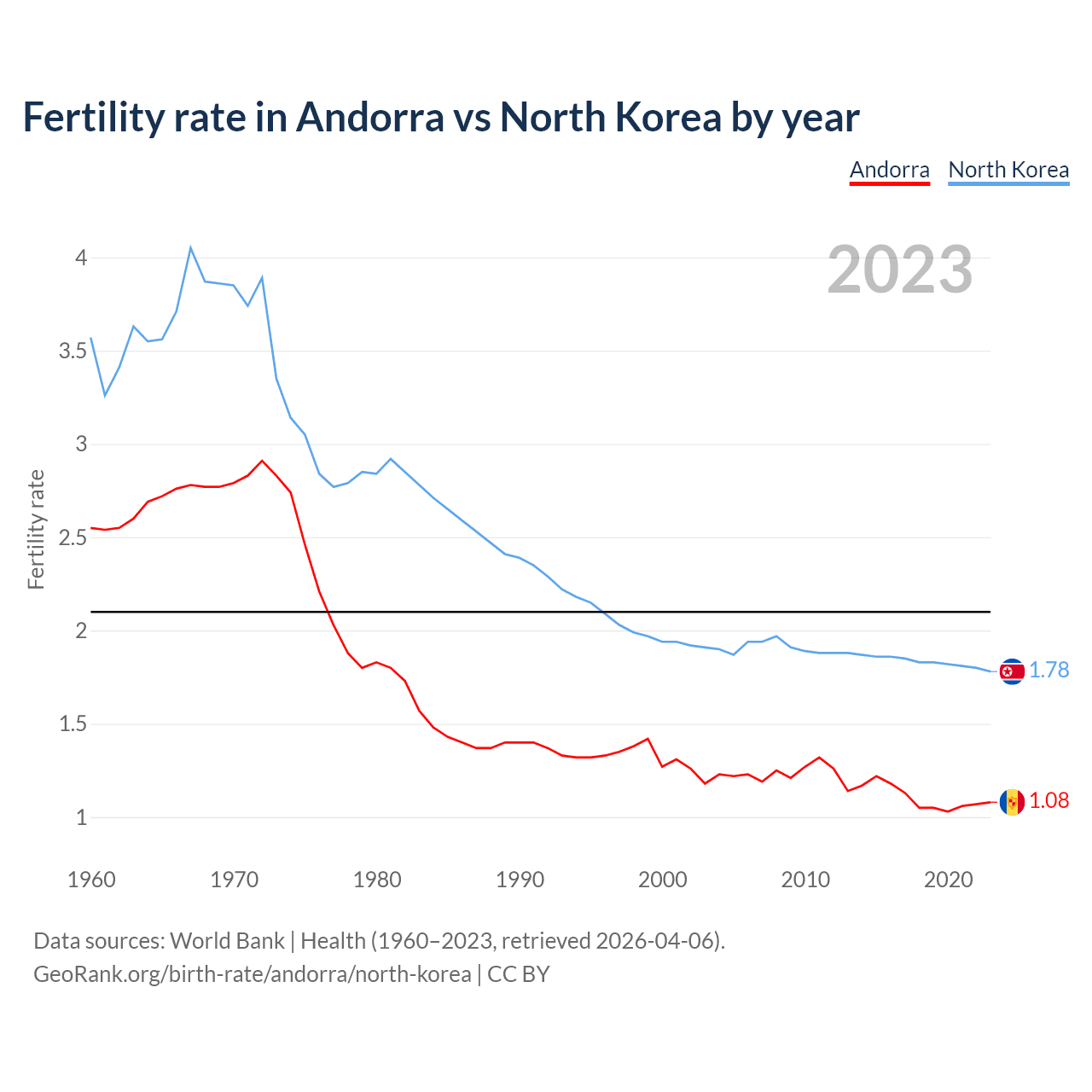 Fertility rate in Andorra vs North Korea by year