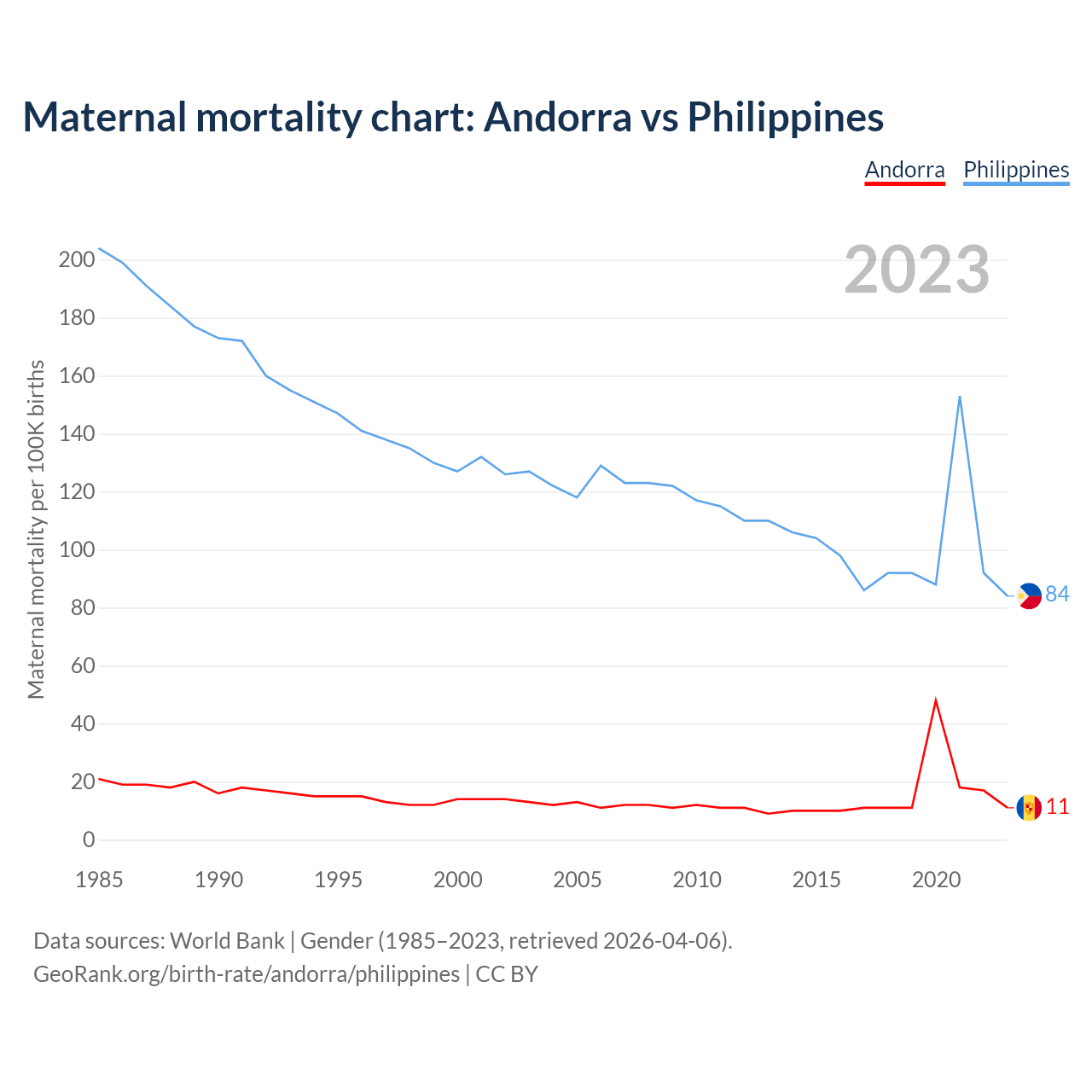 The maternal mortality rate, which is the probability of dying during childbirth or within 42 days of pregnancy termination, is 11 deaths per 100,000 live births in Andorra, compared to 84 deaths in the Philippines.