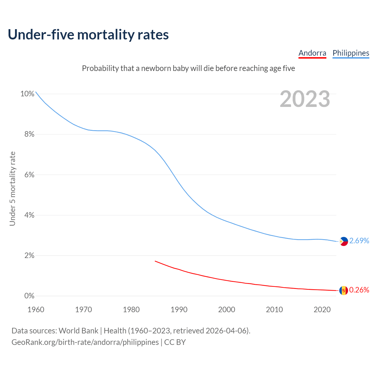 The chance that a newborn baby will die before reaching age five is 0.26% in Andorra and 2.69% in the Philippines. Above is a chart with historical data on under-five mortality rates.