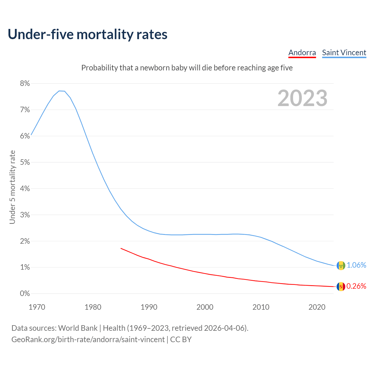 The chance that a newborn baby will die before reaching age five is 0.26% in Andorra and 1.06% in Saint Vincent. Above is a chart with historical data on under-five mortality rates.