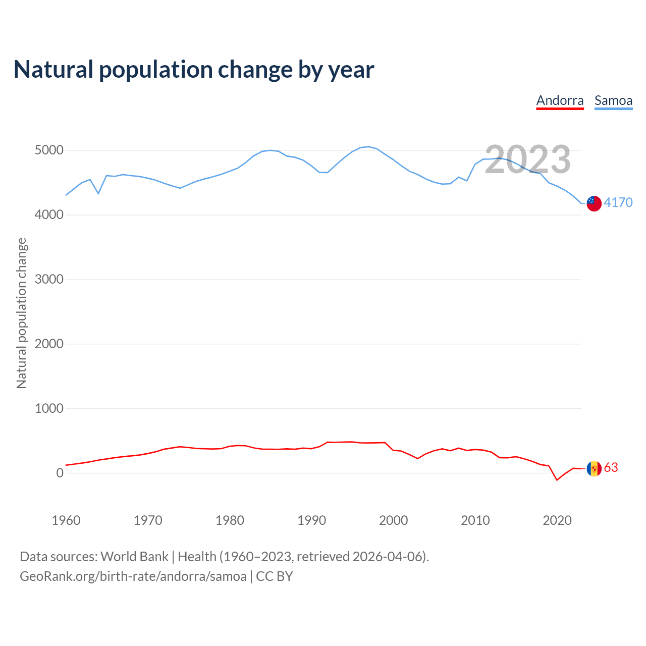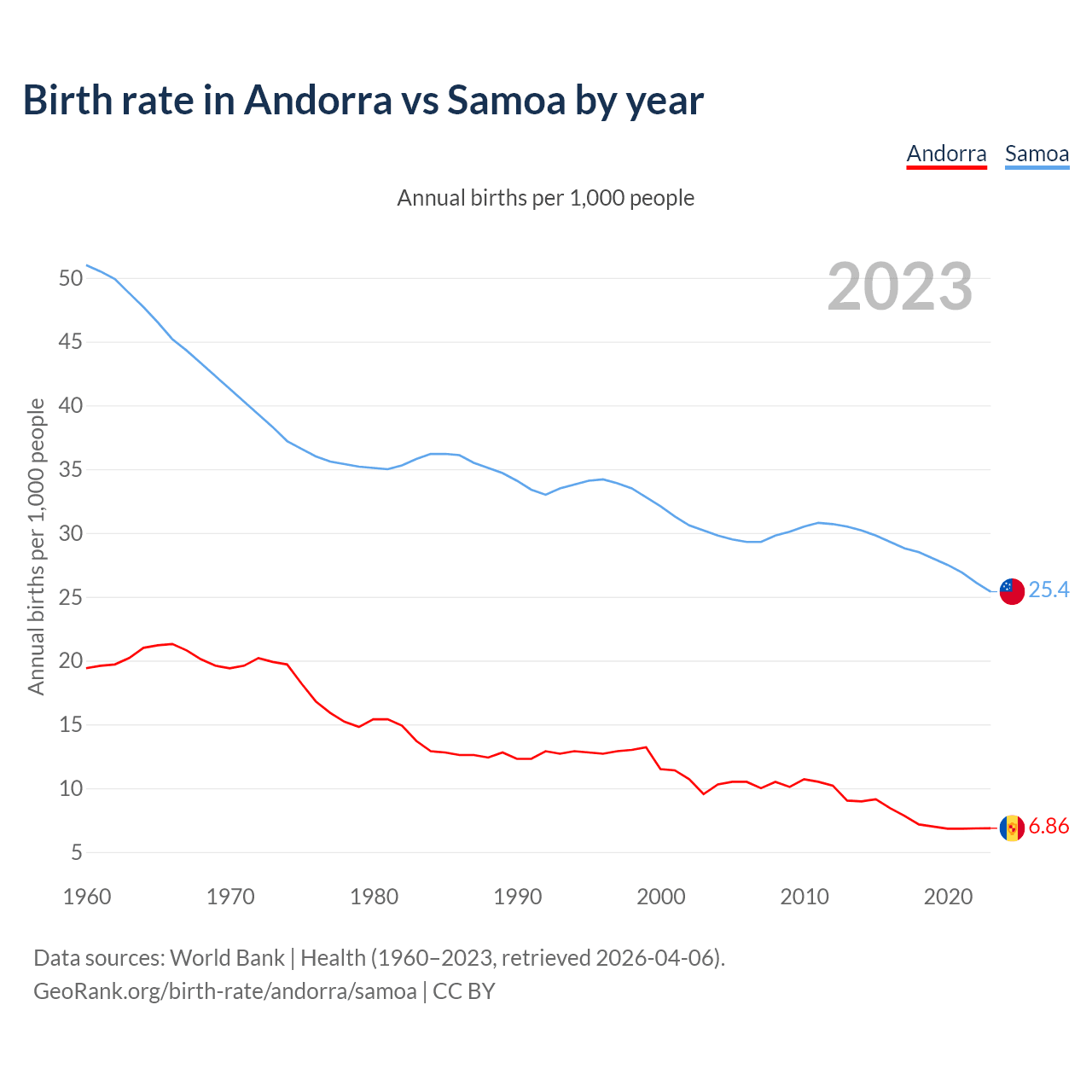 Andorra has an annual birth rate of 6.86 births per 1,000 people, compared to 25.4 for Samoa. The average number of children a woman is expected to have during her lifetime — the fertility rate, is 1.08 in Andorra and 3.83 in Samoa — 253.9% difference.