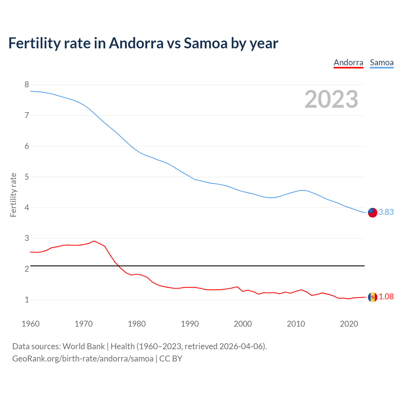 According to the latest available data on birth rates, the fertility rate in Andorra was 1.08 children per woman in 2023, compared to 3.83 in Samoa in 2023. The replacement level is considered to be 2.1 children per woman.