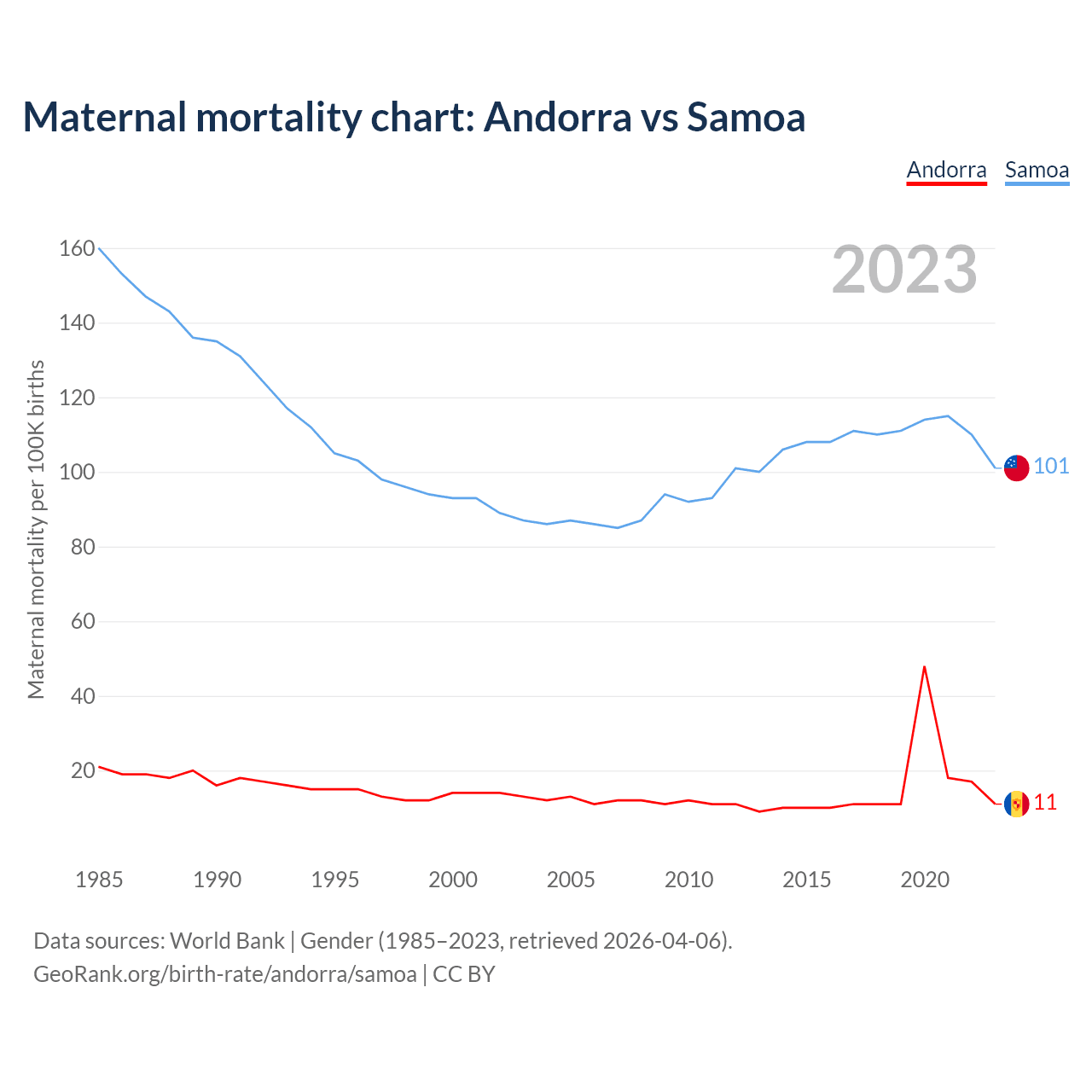 The maternal mortality rate, which is the probability of dying during childbirth or within 42 days of pregnancy termination, is 11 deaths per 100,000 live births in Andorra, compared to 101 deaths in Samoa.