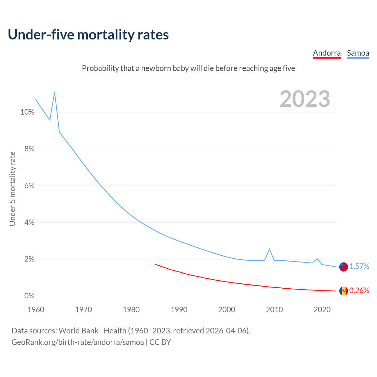 The chance that a newborn baby will die before reaching age five is 0.26% in Andorra and 1.57% in Samoa. Above is a chart with historical data on under-five mortality rates.