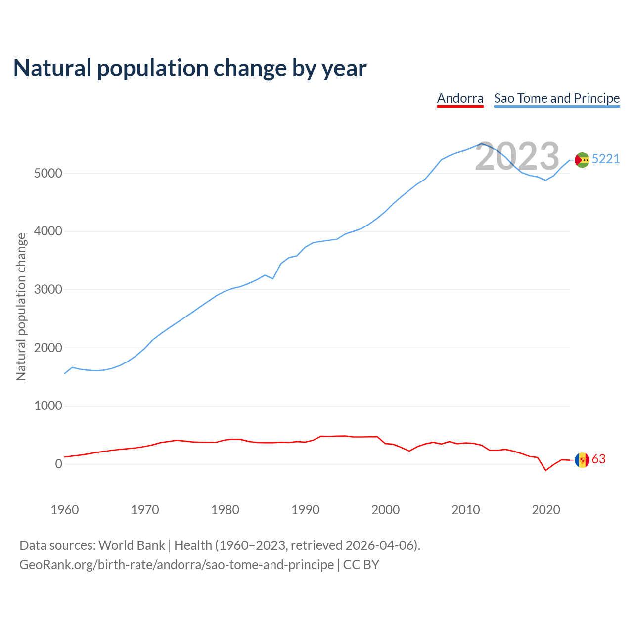 Andorra has an annual birth rate of 6.86 births per 1,000 people, compared to 28.2 for Sao Tome and Principe. The average number of children a woman is expected to have during her lifetime — the fertility rate, is 1.08 in Andorra and 3.64 in Sao Tome and Principe — 236.8% difference.