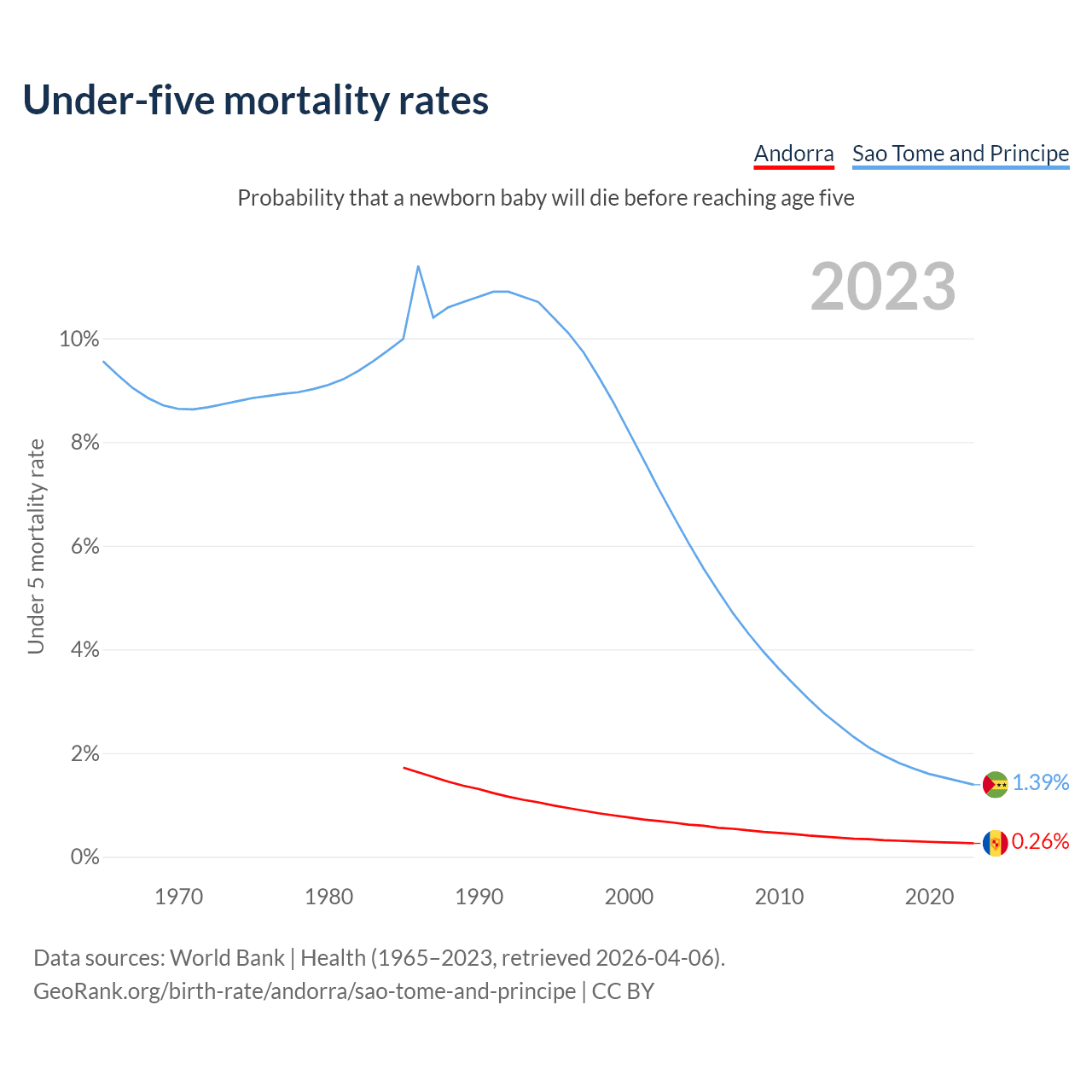 The chance that a newborn baby will die before reaching age five is 0.26% in Andorra and 1.39% in Sao Tome and Principe. Above is a chart with historical data on under-five mortality rates.