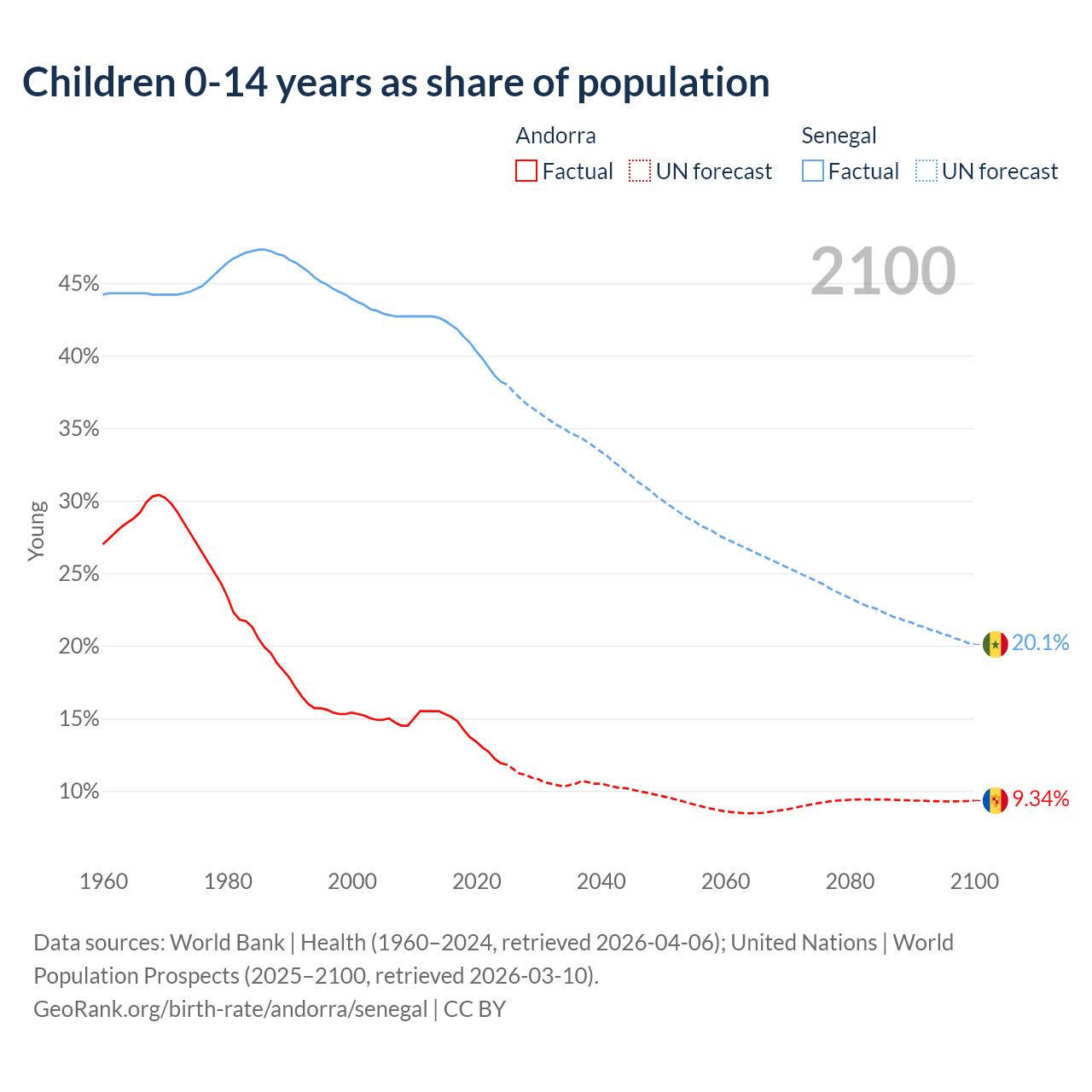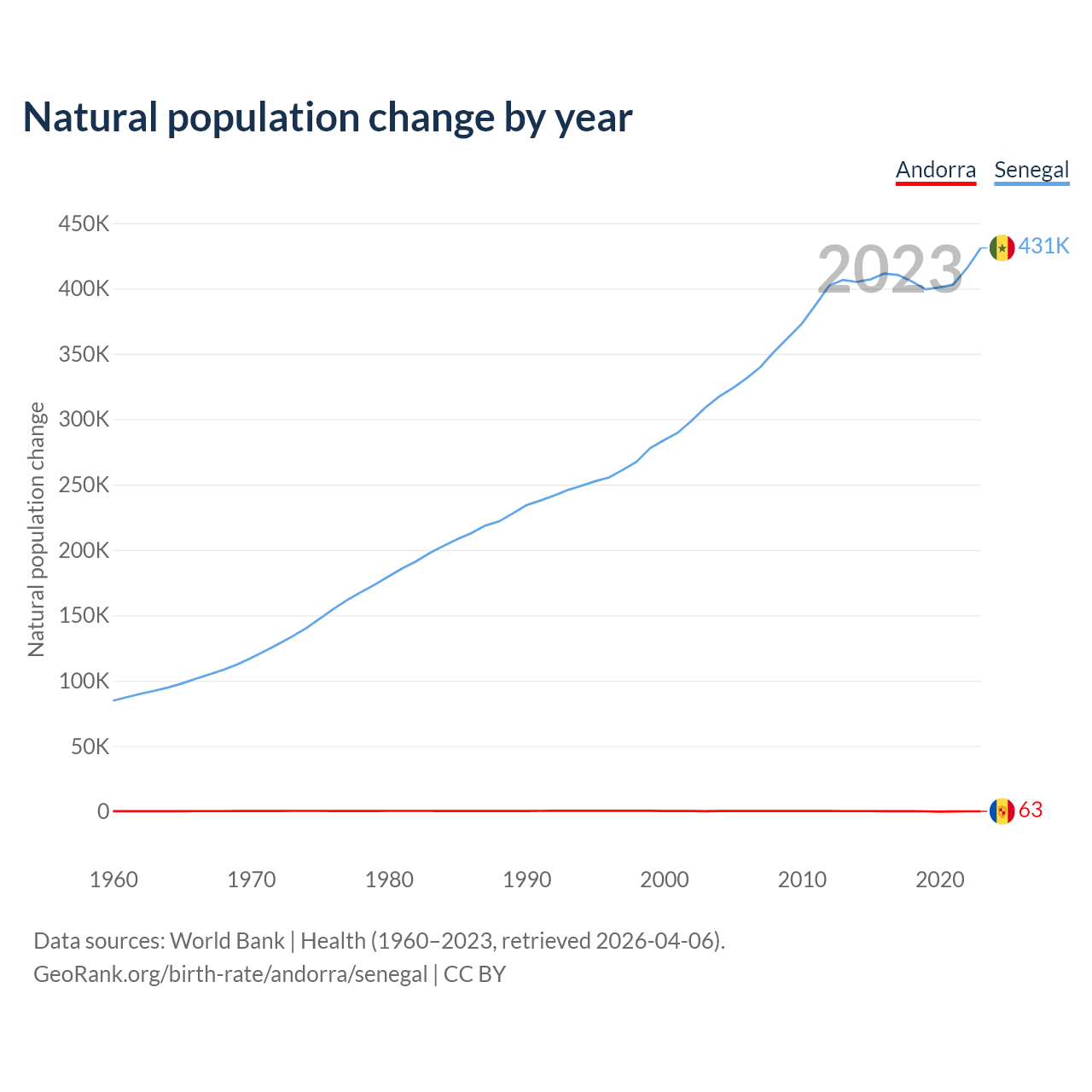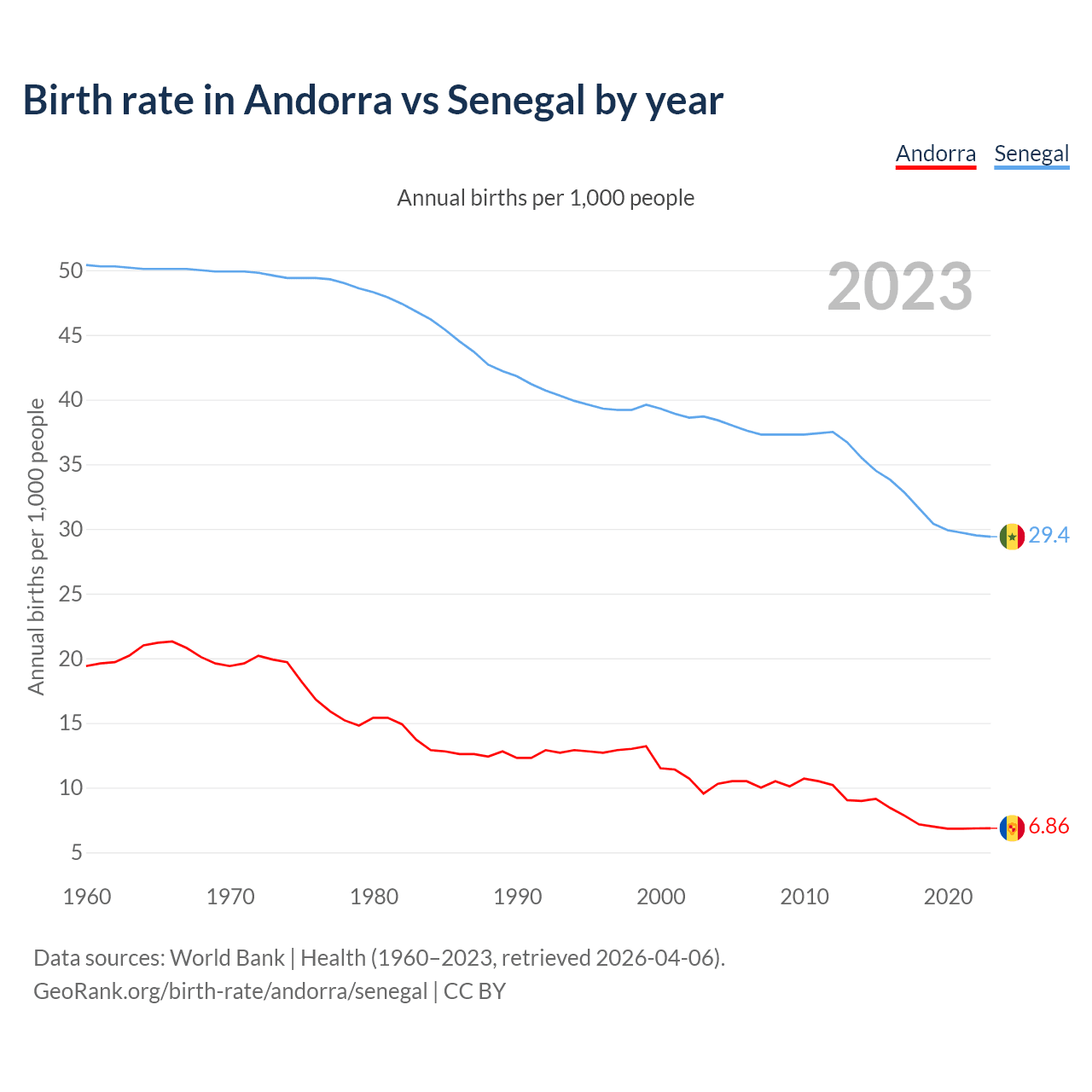 Andorra has an annual birth rate of 6.86 births per 1,000 people, compared to 29.4 for Senegal. The average number of children a woman is expected to have during her lifetime — the fertility rate, is 1.08 in Andorra and 3.82 in Senegal — 252.9% difference.