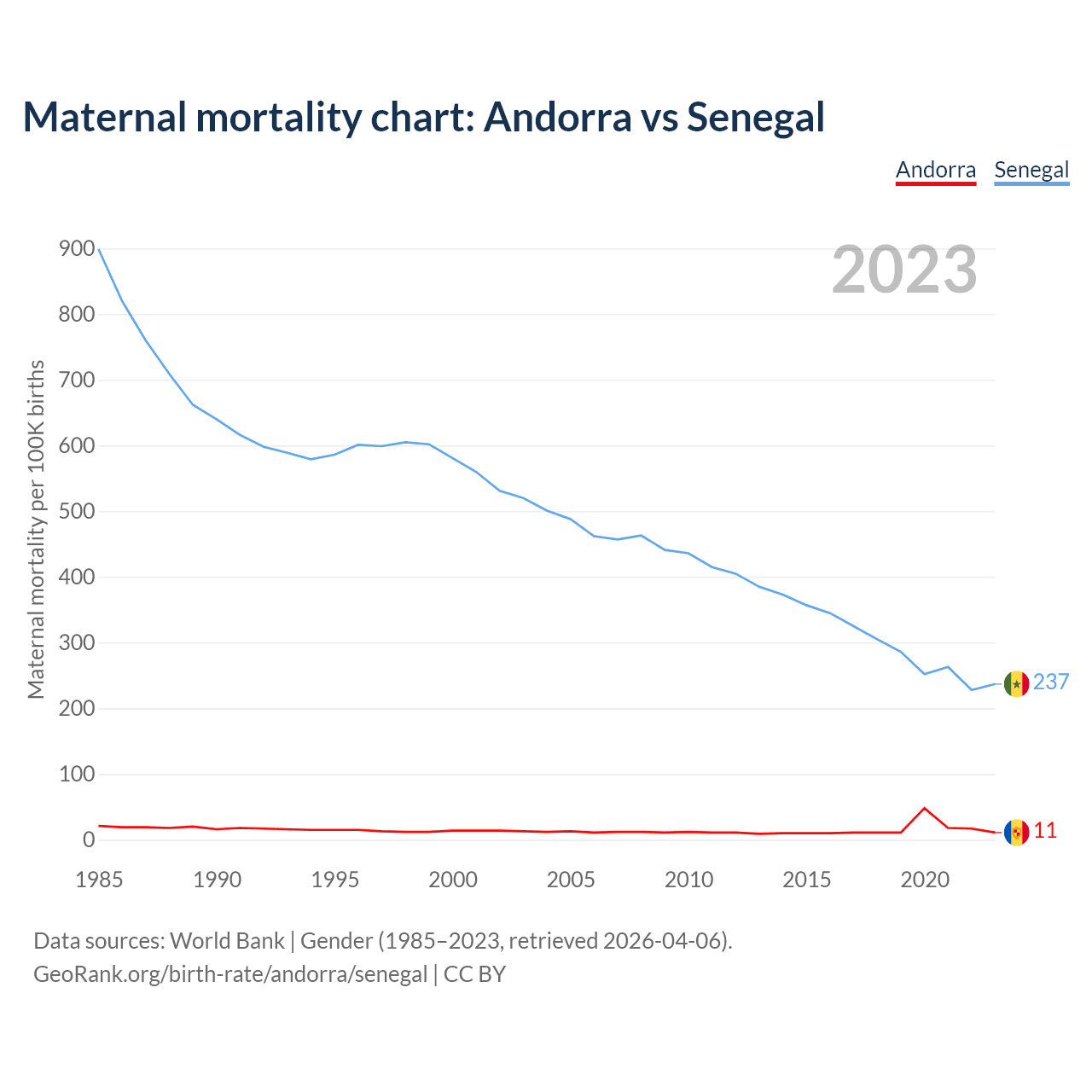 The maternal mortality rate, which is the probability of dying during childbirth or within 42 days of pregnancy termination, is 11 deaths per 100,000 live births in Andorra, compared to 237 deaths in Senegal.