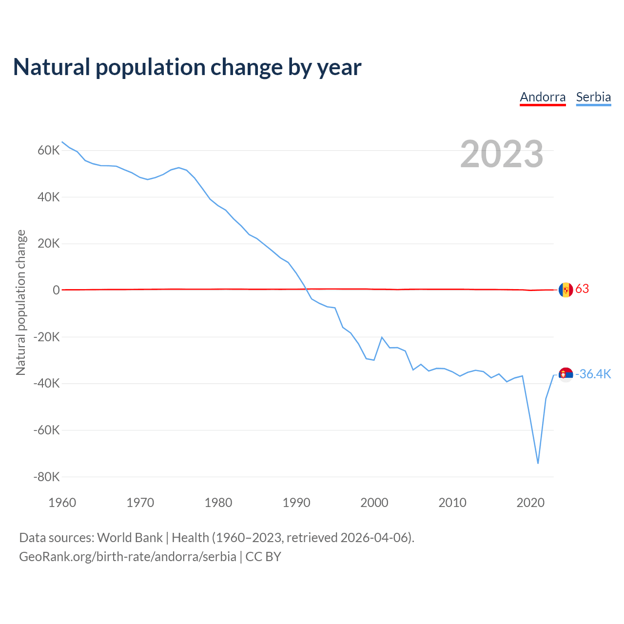 - Andorra is ranked 187/196 by birth rate compared to 159/196 for Serbia.
