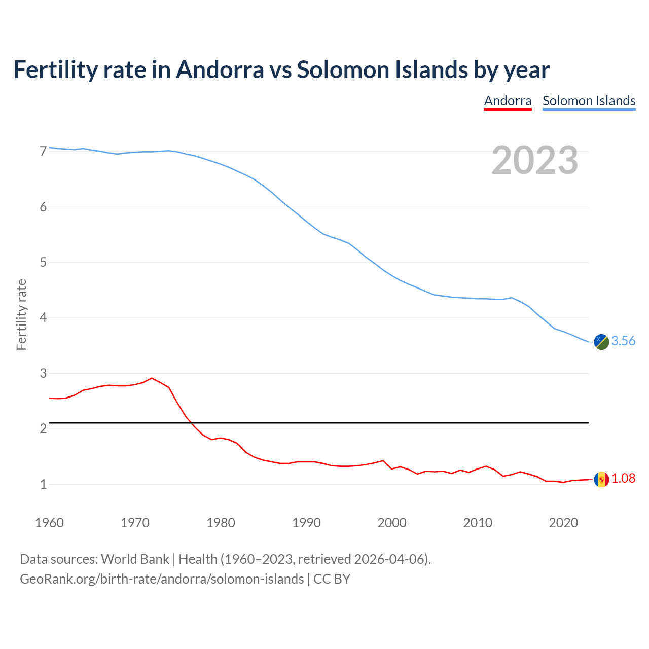 Fertility rate in Andorra vs Solomon Islands by year
