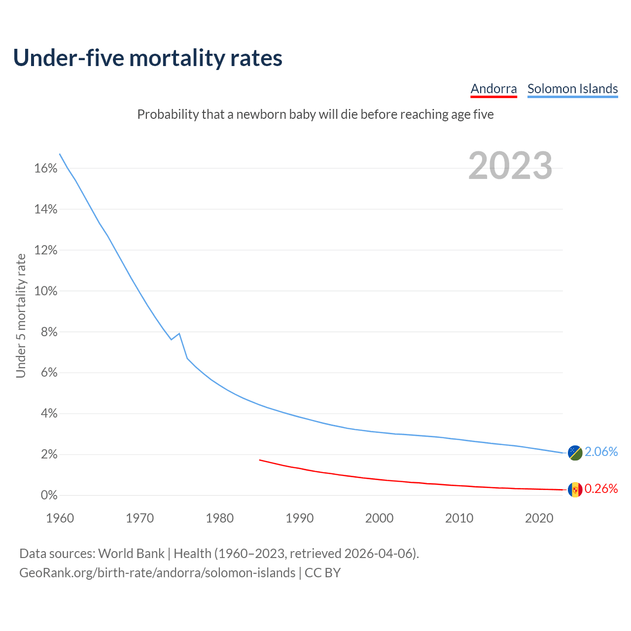 The chance that a newborn baby will die before reaching age five is 0.26% in Andorra and 2.06% in the Solomon Islands. Above is a chart with historical data on under-five mortality rates.